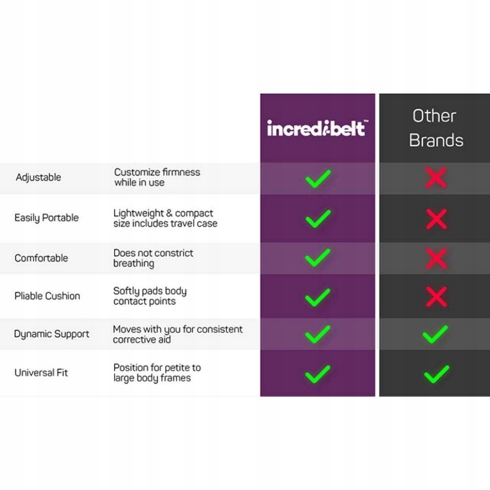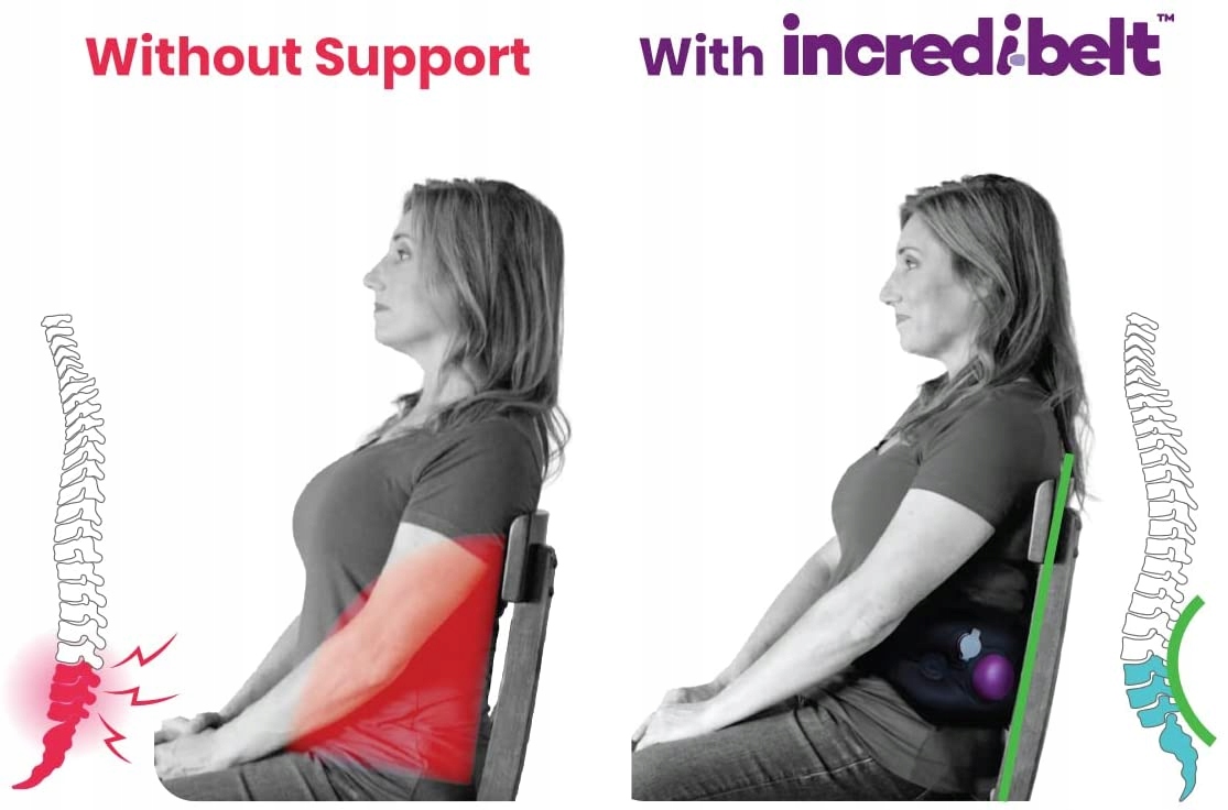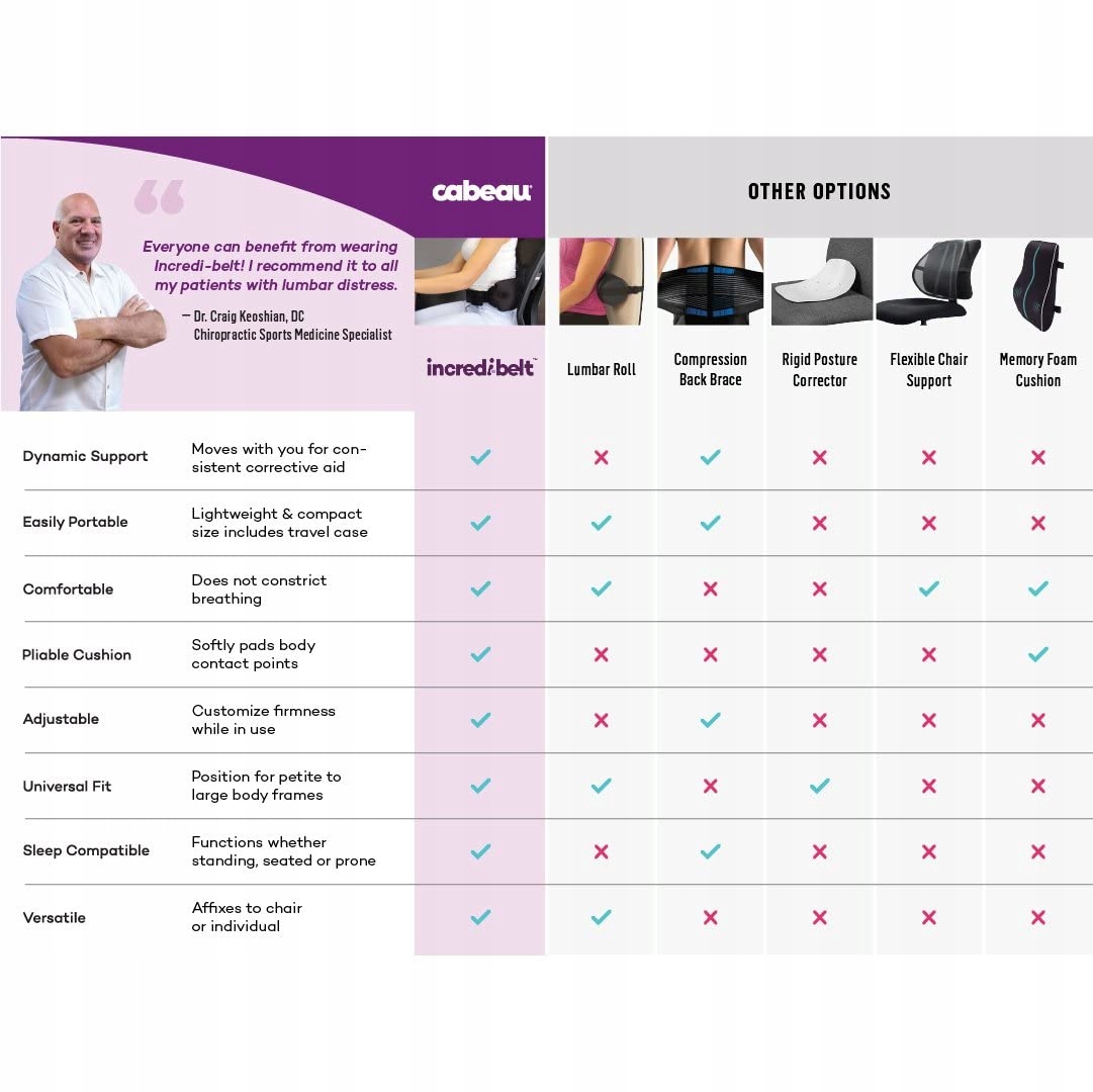 РОЗРОБЛЕНО, ЩОБ ПІДМІСТИТИСЯ ТА ПЕРЕМІЩАТИСЯ З ВАМИ Пояс Cabeau Incredi-Belt кріпиться на поперековому відділі хребта. Пояс допомагає усунути механічний біль у спині, який виникає через нездатність підтримувати S-вигин нижньої частини хребта. Знімає біль у попереку, покращує поставу та допомагає зменшити напругу спини та м’язів.