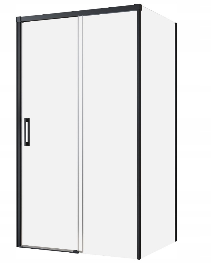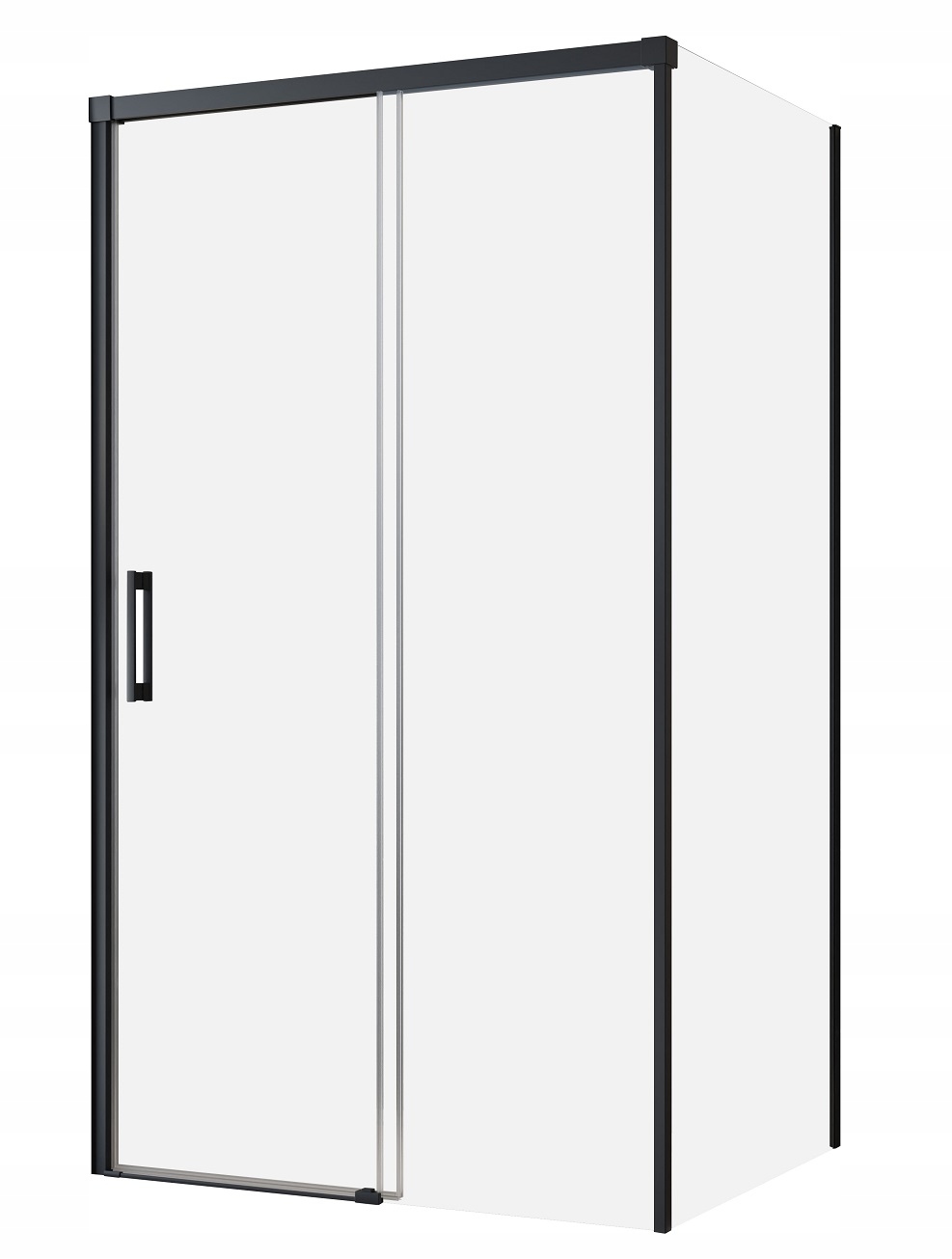 Тема продажу - це душова кабінка з розсувними дверима Ідея Чорна KDS у лівій версії у скляній прозорі з чорними профілями без душу.