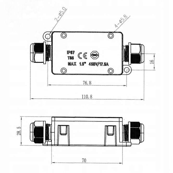 ✔ герметичний роз'єм з 2 дрочками - це ідеальне рішення, яке допоможе нам підключити всі види електричних пристроїв, таких як фари, експозиції, зовнішні лампи тощо. . Забезпечуючи їх зв’язок проти води та всіх інших несприятливих погодних умов, таких як УФ -випромінювання, мороз або сніг. Всередині він має гніздо (куб) завдяки якому ми можемо з'єднати дроти з поперечним перерізом від 0,75-1,5 мм2 , а діаметр кабелю може бути від 4 до 8,5 мм.