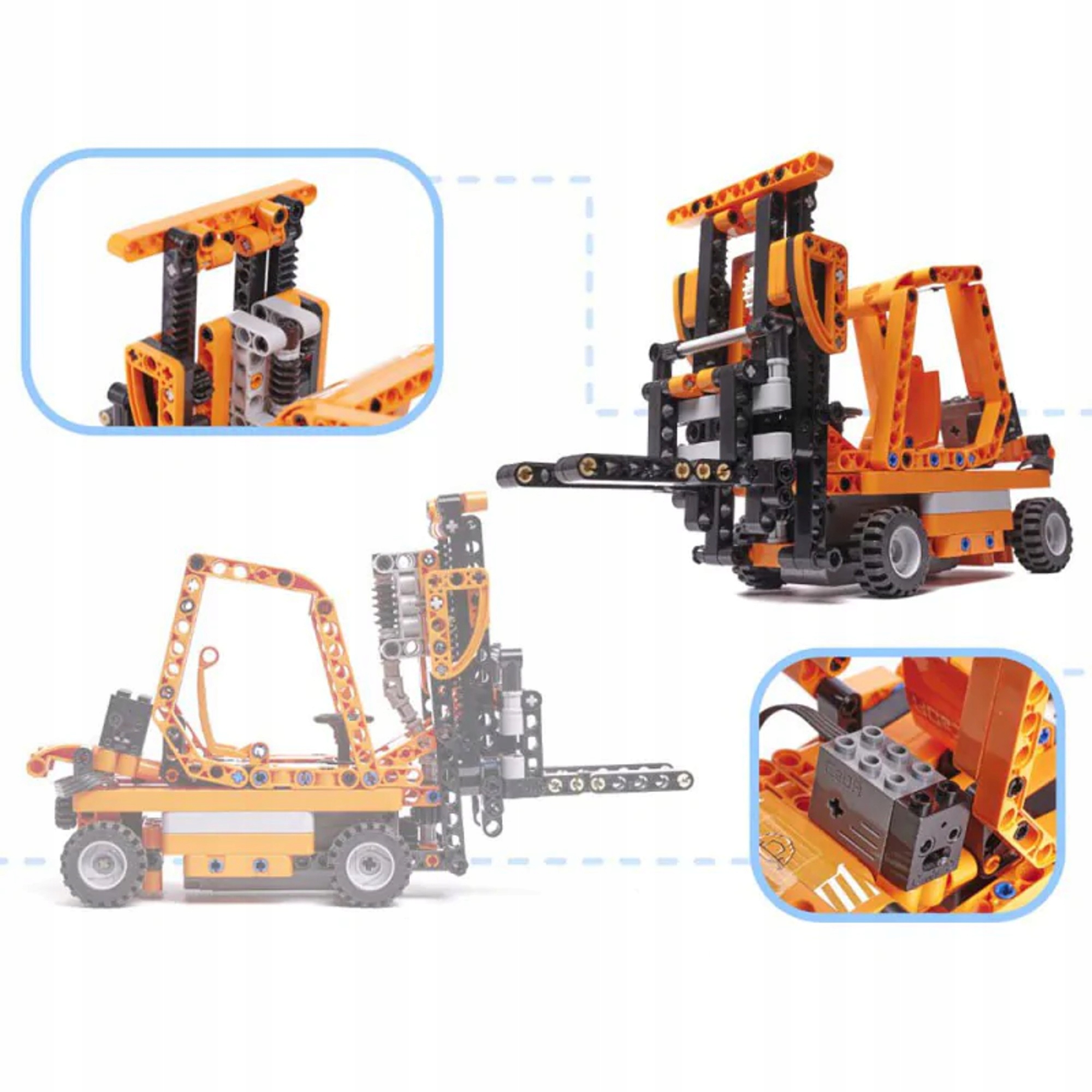 Набір складається з 634 елементів і дозволяє самостійно побудувати 10 конструкцій, включаючи вантажівку, навантажувач, ліфт, кран, напівпричіп, контейнеровоз , кран, контейнерякі звукорегульовані та світлові. Пристрої були створені з особливою увагою до деталей, що забезпечить неймовірне задоволення. Блоки міцні, а багато елементів набору рухливі. Деякі машини оснащені 4 гумовими колесами, які дозволяють їм пересуватися по різних поверхнях. Машинки мають помаранчевийкузов з чорними елементами.