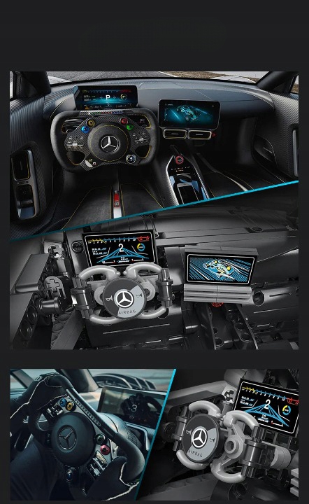 Mercedes -AMG One Sports Auto B> Mercedes Sports Car - AMG One. , оснащений ексклюзивними, спеціальними шинами, затвердженими michelin . Усі чотири колеса оснащені незалежними амортизаторами підвіски. Розроблений Бруно та командою CADA протягом трьох років, це колекціонер, моторизована версія та модель автомобіля, яка інтегрує багато оригінальних технологій. Обтічна форма та спойлер, що нагадують плавник акули, допомагають прискорити машину. Весь тіло автомобіля надруковано у високій роздільній здатності, що ідеально відображає декор та постачання оригіналу. Транспортний засіб був створений з особливою увагою до деталей, , що забезпечить дивовижну забаву.