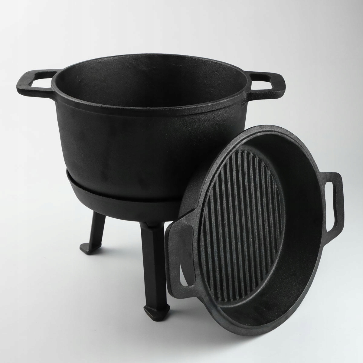 Полювання на казан - це відмінна страва для приготування страв на під відкритим небом - тушковане м'ясо, овочі, різні види тушкованих, печей та супів . Довга, повільна приготування їжі над багаттям стукає по вилученню інтенсивного аромату та смаку приготованих страв. Казрон завдяки його потужності (8 л) дозволяє готувати посуд одночасно для кількох людей, саме тому він буде ідеальним під час сімейних зустрічей або з друзями. 4 Казрон також можна повісити над вогнем завдяки ручці . Додатковим плюсом є можливість демонтажу ніг. це дозволяє легко транспортувати та зберігати товар. Страви, приготовані в ньому, тривалий час підтримують температуру, що сприяє тривалому бенкеті.
