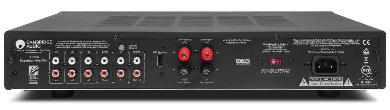 AXA35 забезпечує потужність 35 Вт для кожного каналу, інтегрований фонопідсилювач з рухомим магнітом для любителів вінілових платівок, білий дисплей і 6,4-мм роз’єм для навушників.