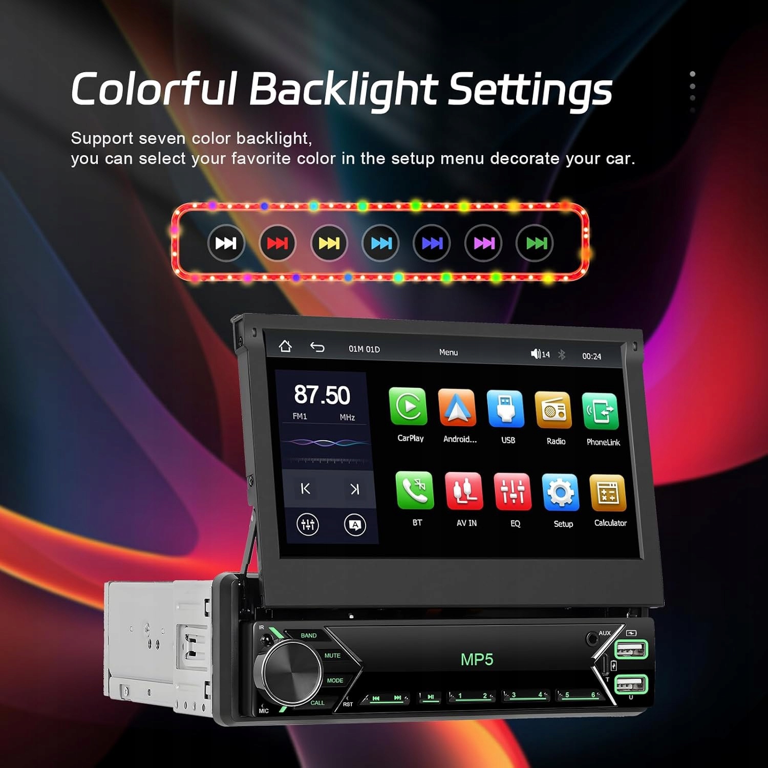 - 【Автомобільний радіоприймач Carplay 1 DIN з дисплеєм】7-дюймовий великий ємнісний складний сенсорний екран із автоматичним обертанням, короткий корпус, легка вага, швидка відповідь, без затримки. Ми пропонуємо широкий вибір кольорів фону та ключового освітлення. Порт TF/SD-карти/USB/AUX на передній панелі для різних режимів відтворення медіа.