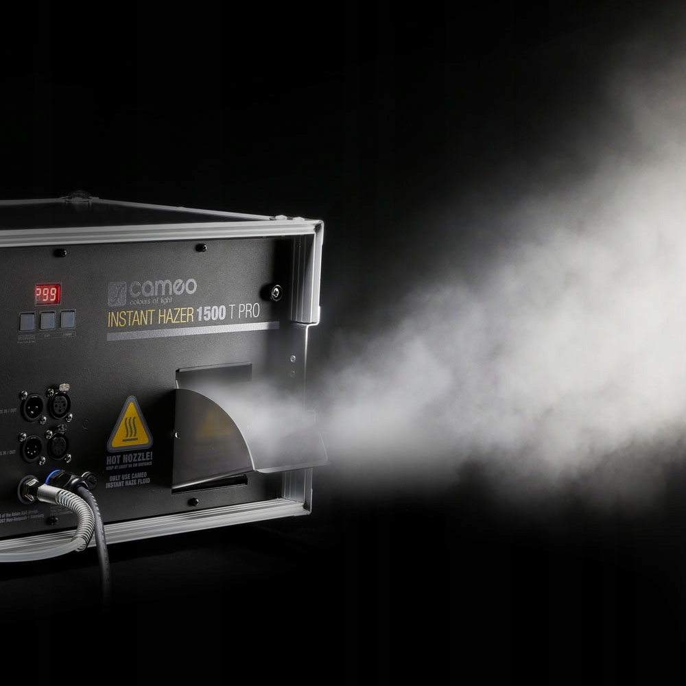 миттєвий Hazer 1500 T Pro можна керувати в 2-канальному режимі DMX або використовувати в автономному режимі. Він оснащений 3- та 5-контактними входами та виходами для сигналу DMX. Міцна конструкція має 3-хідний світлодіодний дисплей, отвір для 5-літрового Ka Nister з рідиною і стійкий до перегріву. Cameo Instant Hazer 1500 T Pro виробляє дуже маленьку, довгу пару, яка з її атмосферою збагатить будь -яке світлове шоу.