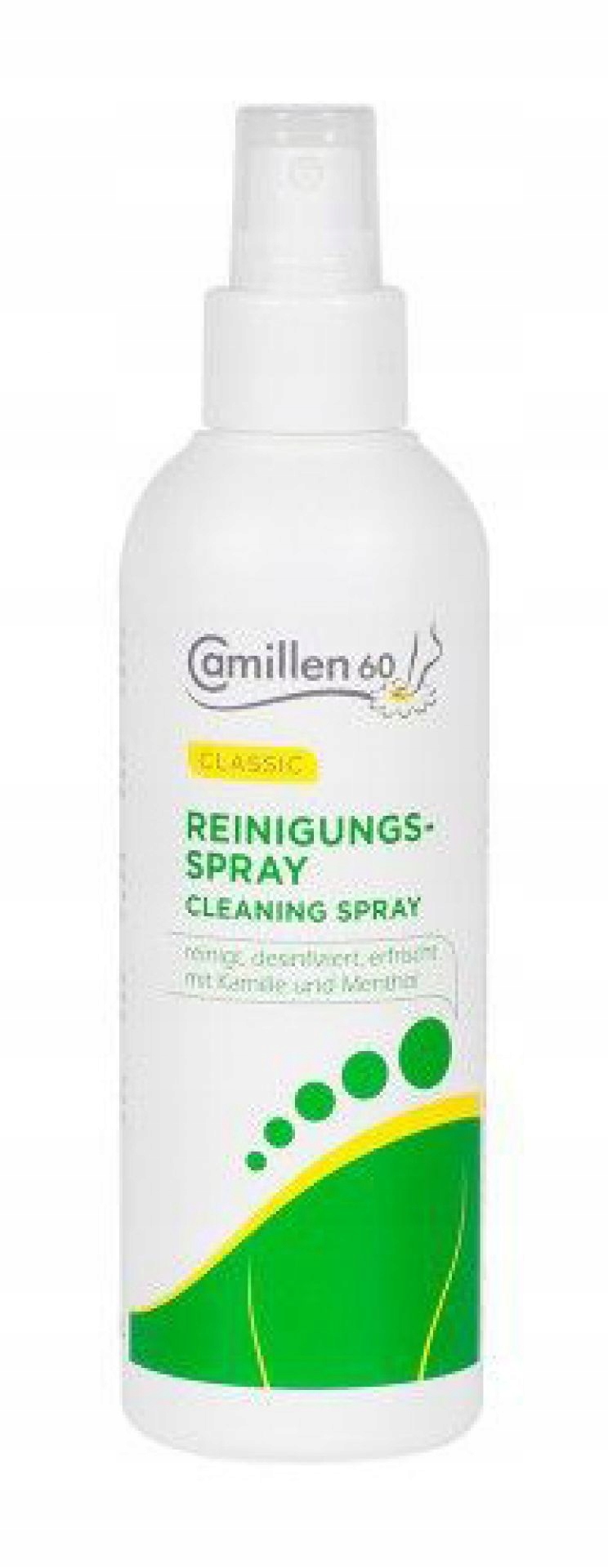 Camillen60 Reinigungs-Spray - це засіб для швидкого попереднього очищення спиртом, підходить для догляду за ногами без купання. Очищає шкіру перед процедурою, сильно освіжає та охолоджує завдяки високому вмісту ментолу. 30% вміст спирту робить Camillen60 Reinigungs-Sprayм’яким дезінфікуючим засобом, однак цей продукт не є схваленим дезінфікуючим засобом.