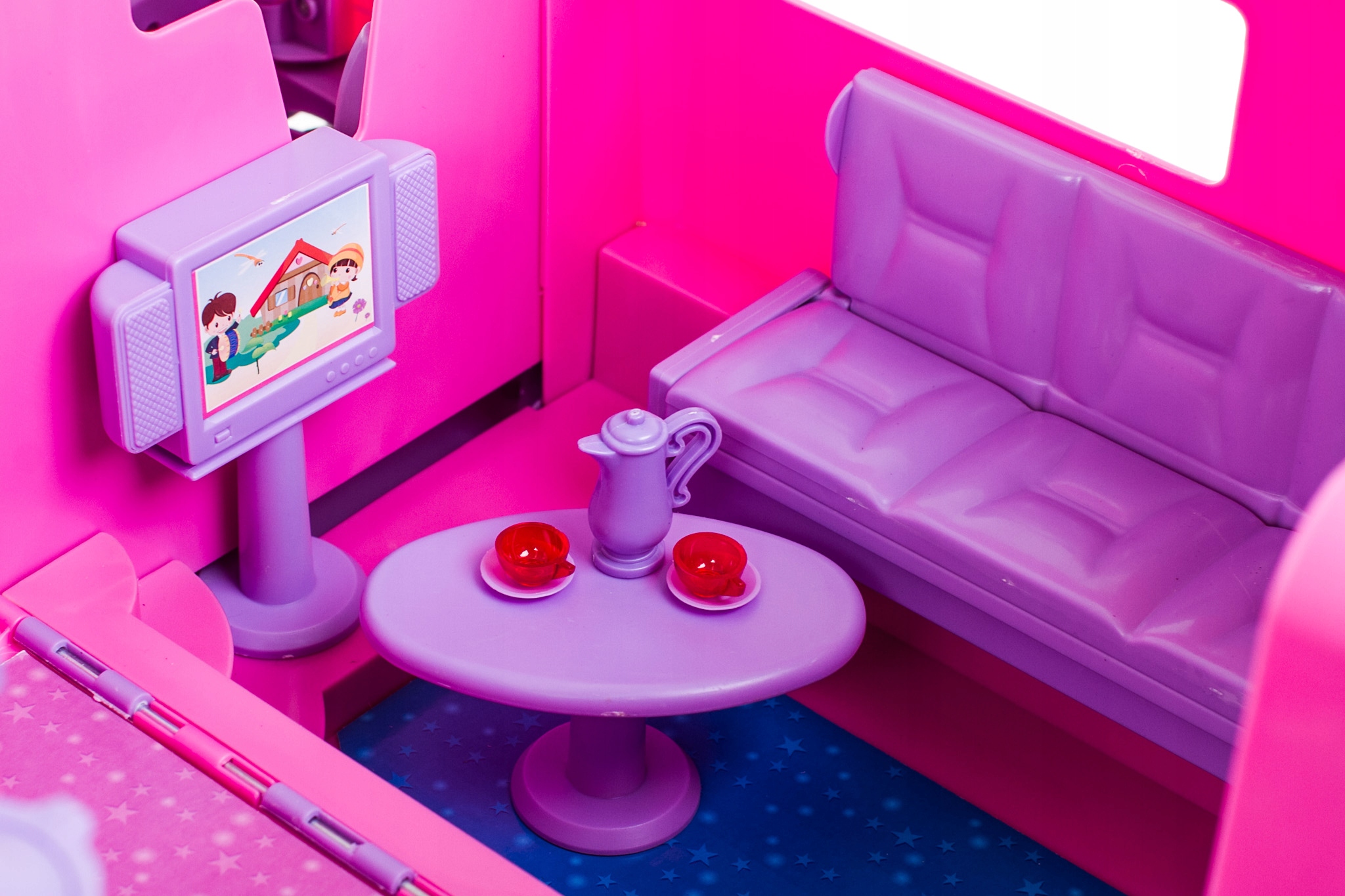 Чудовий великий кемпер із багатьма сюрпризами, захованими всередині. Внутрішнє обладнання, необхідне під час поїздки ляльки на відпочинок:меблі, розкладний диван та багато іншого.