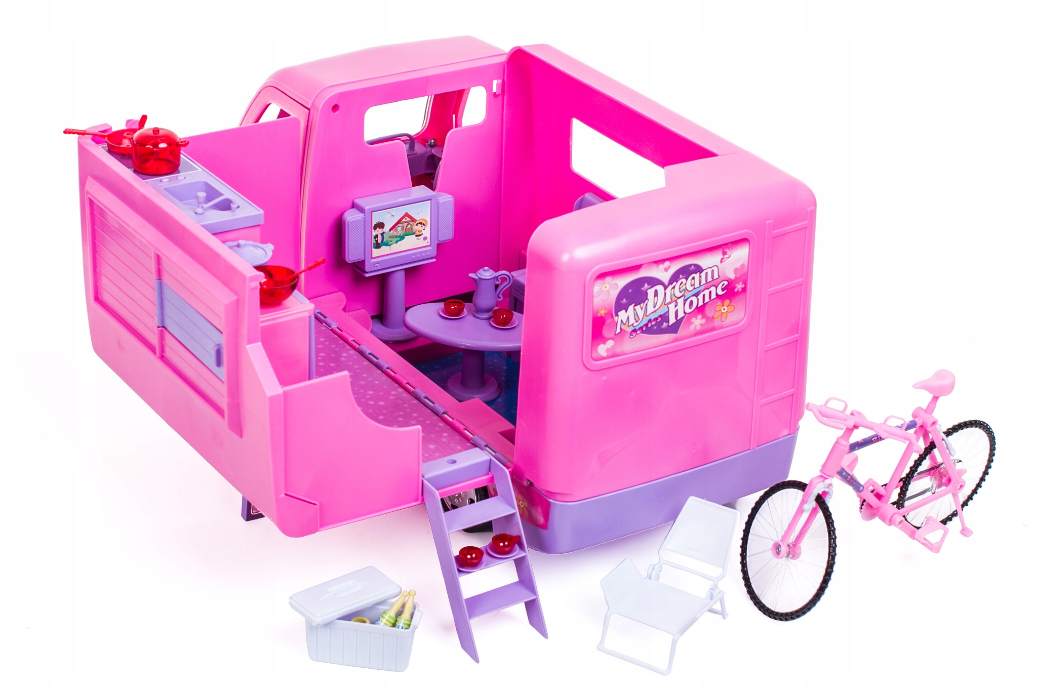 CAMPER KAMPER DLA LALEK duży rozkładany auto samochód dla lalki + rower
