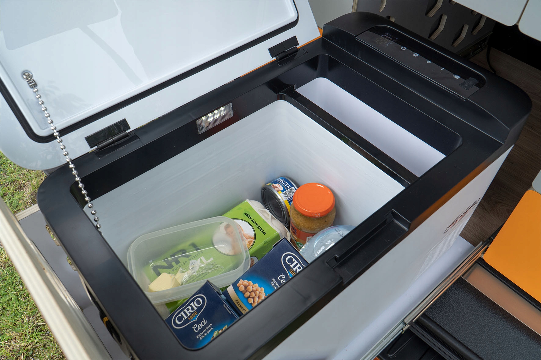 Додаткова опція - ефективний та економічний компресорний холодильник об'ємом 19 л. Він легко заморожує продукти до -18 градусів навіть у найспекотнішу погоду. Як і модуль Бістро, холодильник живиться від розетки прикурювача.