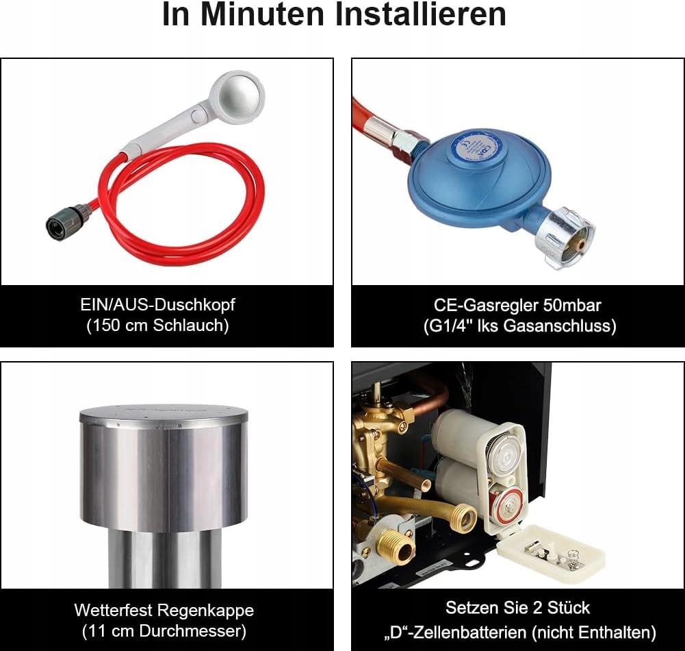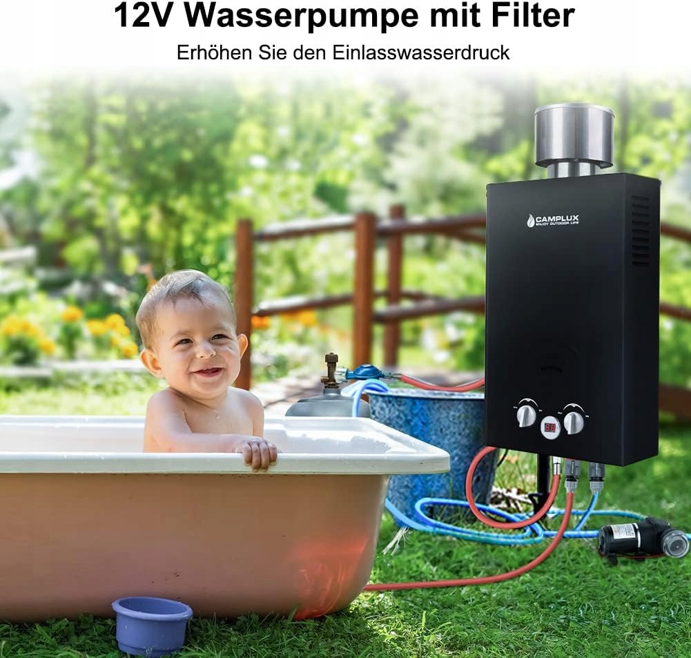 Газовий водонагрівач Camplux 10 літрів з водяним насосом BW264BCP120-DE, зовнішній газовий душ без резервуара для миття коней, кемпінгу, подорожі в кемпері, 50 мбар, зріджений газ