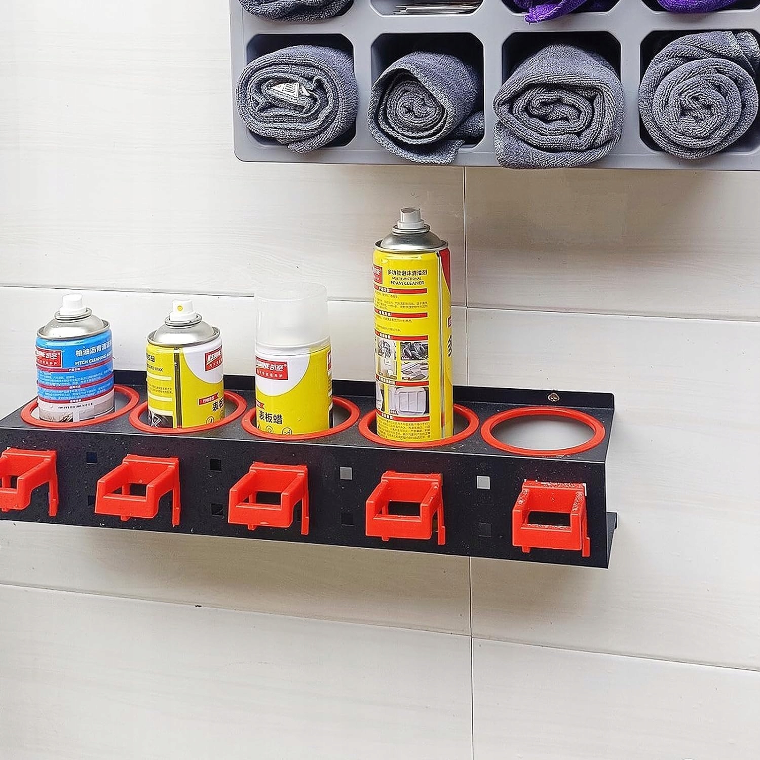 ➡ [високоякісна сталь]: , виготовлена з постійної холодної сталі, полиці, встановлена на стіні, пропонує виняткову міцність, стійкість до споживання та прості в очищенні поверхні; Пластикові гачки з високою тривалістю були розроблені для витримки важких вантажів та розміщення засобів догляду за автомобілями, пляшки з садовим спреєм; Завдяки стійкій до іржі обробці порошком та закругленими перфорованими краями, що запобігають використанню інструментів, елегантна червоно-чорна конструкція є стильною та функціональною.