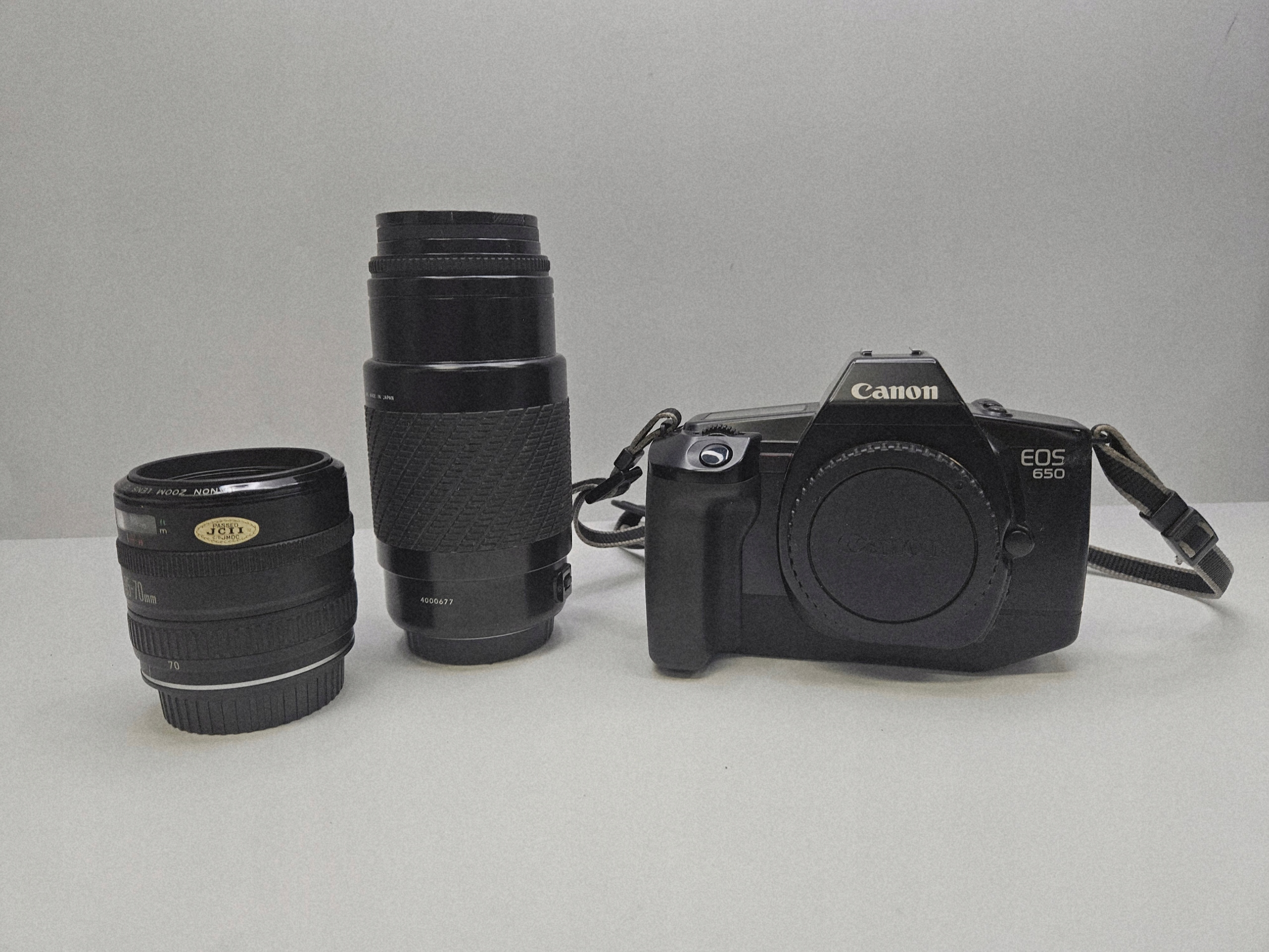 Класична аналогова дзеркальна камера Canon EOS 650, перша модель із серії EOS, представлена в 1987 році. 35 -мм кінокамера, сумісна з Canon EF. Об'єктиви: