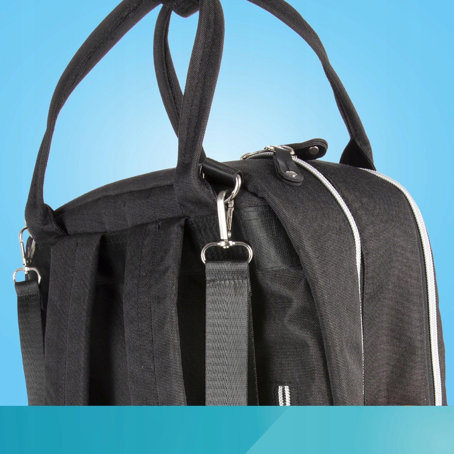 Водонепроникна кишеня для мокрого одягу або підгузника, застібається на блискавку. Дві бічні кишені для вологих серветок і чашки або пляшки з водою без необхідності відкривати рюкзак. Додатково термоізольовані кишені та непомітна кишеня для документів.