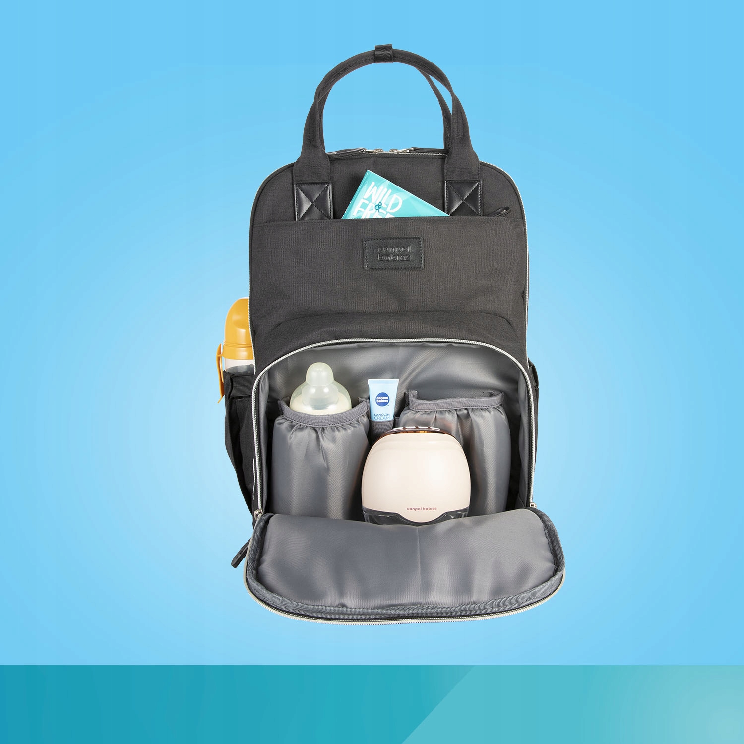 Має практичні кишеніі коврик для сповивання - ідеально підходить для прогулянок і подорожей. Водонепроникна кишеня для мокрого одягу або підгузника застібається на блискавку. Рюкзак також має дві бічні кишені для вологих серветок та/або пляшки з водою, без необхідності її відкривати. Теплоізоляційні кишені для збереження тепла та непомітна кишеня для документів. Крім того, він має зручні ручки для кріплення до коляски та широкі регульовані ремені.
