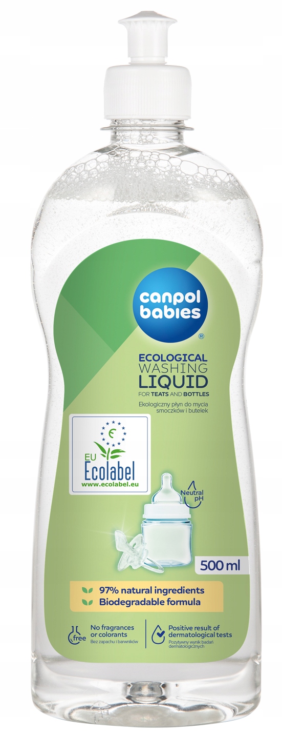 Екологічна рідина Canpol babies для миття пляшечок і пустушок створена з думкою про здоров'я і безпеку дітей. Рідина гіпоалергенна, безбарвна і містить 97% натуральних компонентів. Ефективно та якісно видаляє всі залишки молока, соків, каш та їжі. Змивається ідеально. Делікатний рецепт, без додавання ароматизаторів і барвників, ніжний для рук. Продукт має нейтральний pH для шкіри та отримав позитивний результат дерматологічних тестів. Упаковка дуже ефективна - достатньо лише невеликої кількості рідини для ефективного очищення дитячих аксесуарів, таких як пляшечки, соски, прорізувачі, дитячий посуд, іграшки та деталі молоковідсосу. Екологічна рідина для чищення пляшечок і пустушок Canpol babies сертифікована екологічною маркою ЄС – офіційною європейською відзнакою, яка присуджується екологічно чистим продуктам, які відповідають високим стандартам якості та здоров’ю: PL/019/009.