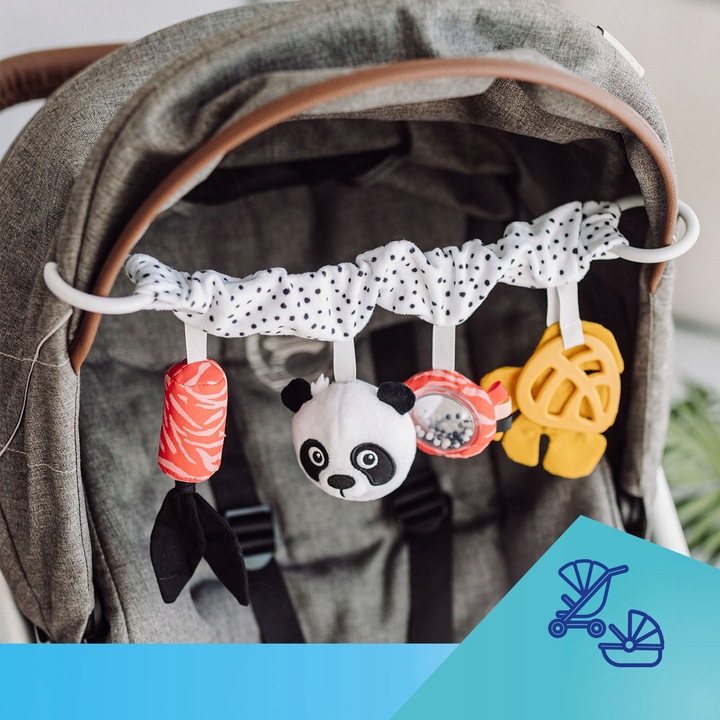 Сенсорна підвіска для коляски — чудова ідея для першої іграшки для малюків, яка зробить кожну прогулянку та подорож приємнішою. Ідеально підходить для коляски та автокрісла - підвіска кріпиться за допомогою безпечних і зручних пластикових кілець, розташованих на обох кінцях.
