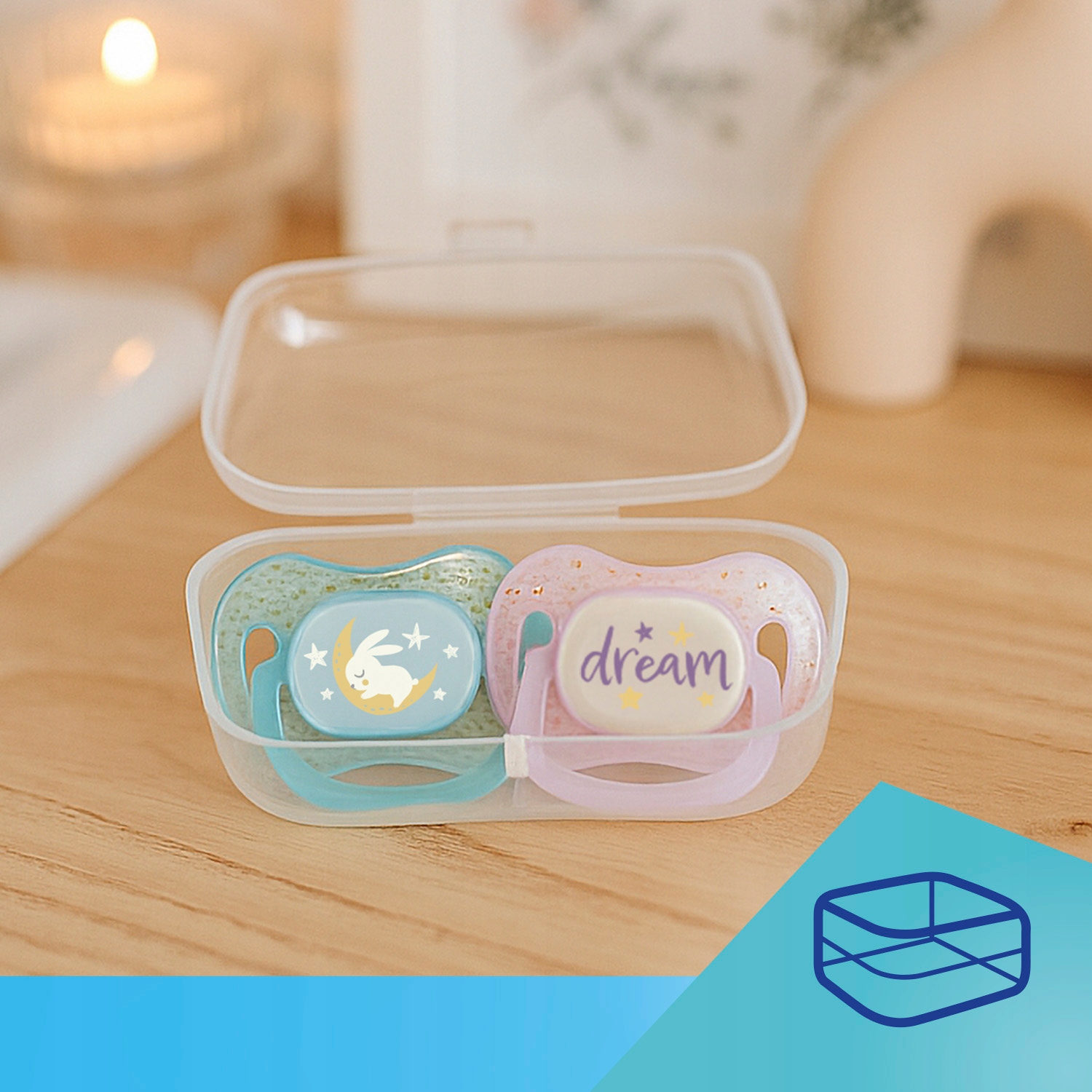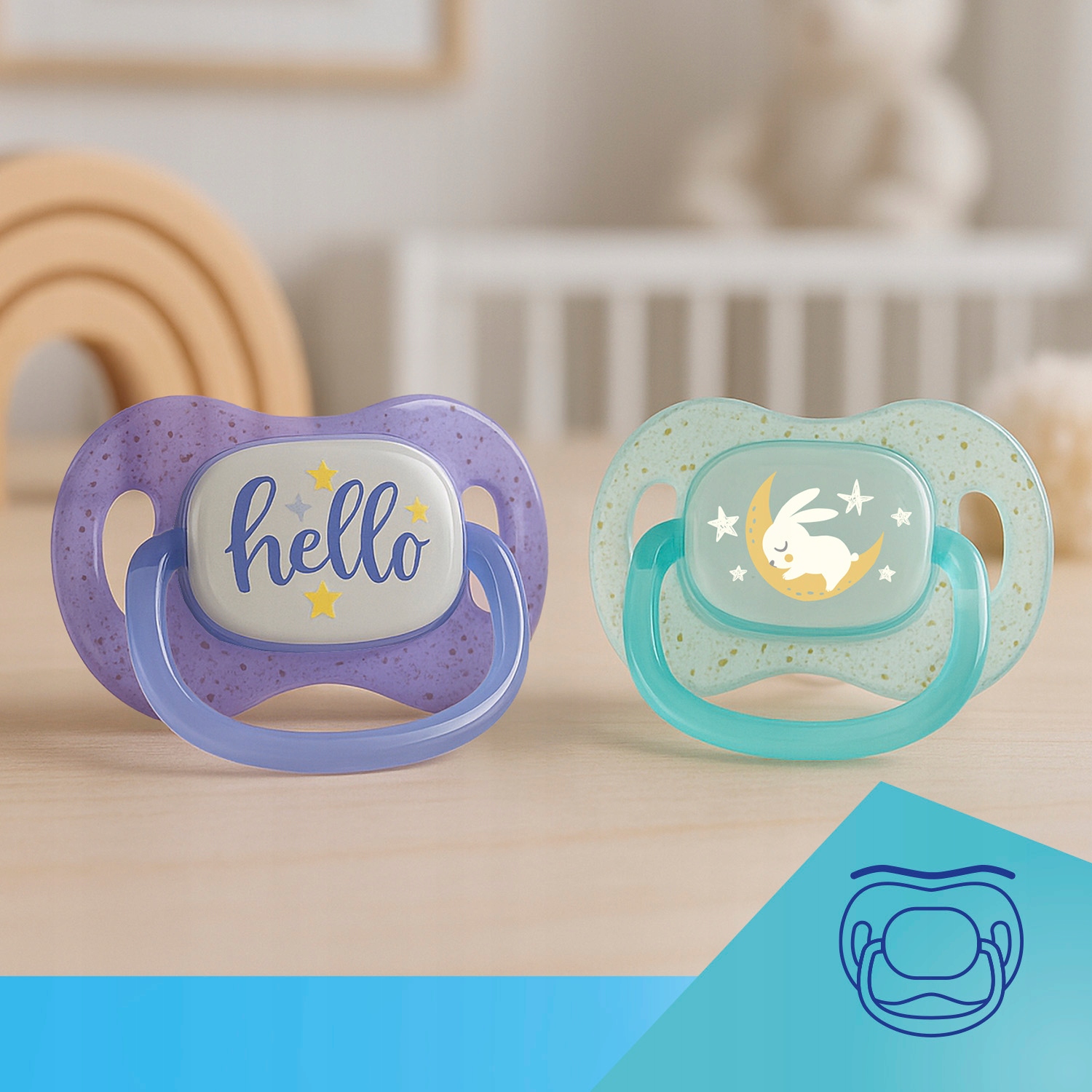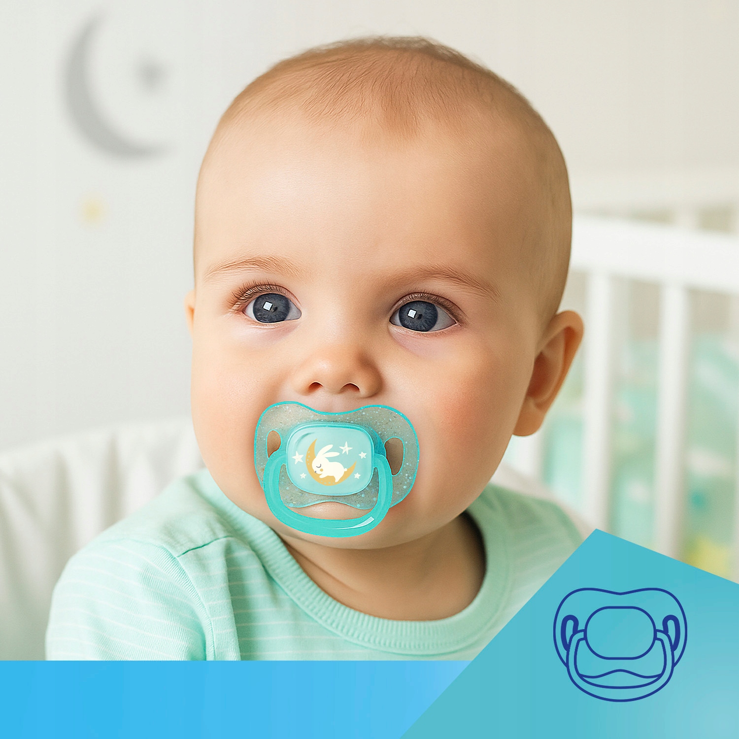Соска NightGlow світиться в темряві, завдяки чому її легко знайти вночі, не будячи дитину без потреби. Створено з думкою про спокійний сон дитини та повсякденний комфорт.