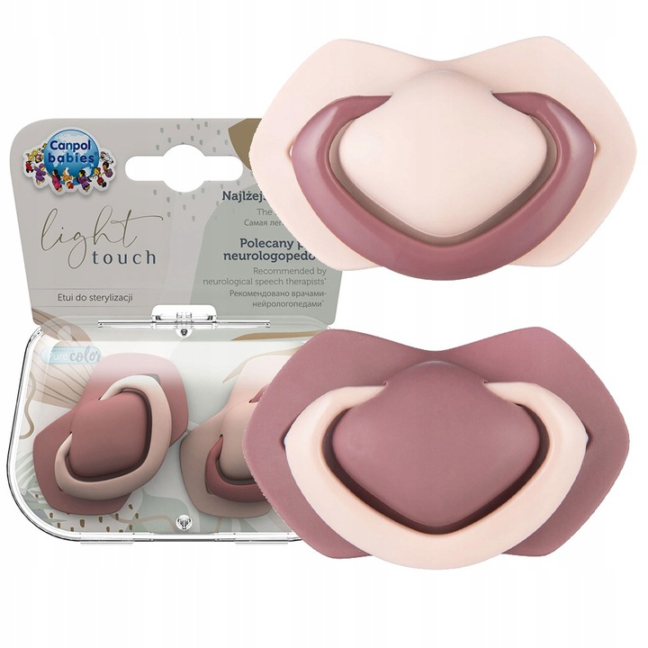 Соски Light Touch з колекції PURE COLORстворені для максимального комфорту для найменших дітей. Їх виключно м'яка силіконова гумка вимагає менше зусиль при смоктанні, а легкий профільований щиток не обтяжує прикус і гарантує вільне дихання, що, за словами фахівців, суттєво впливає на правильний розвиток ротової порожнини дитини.