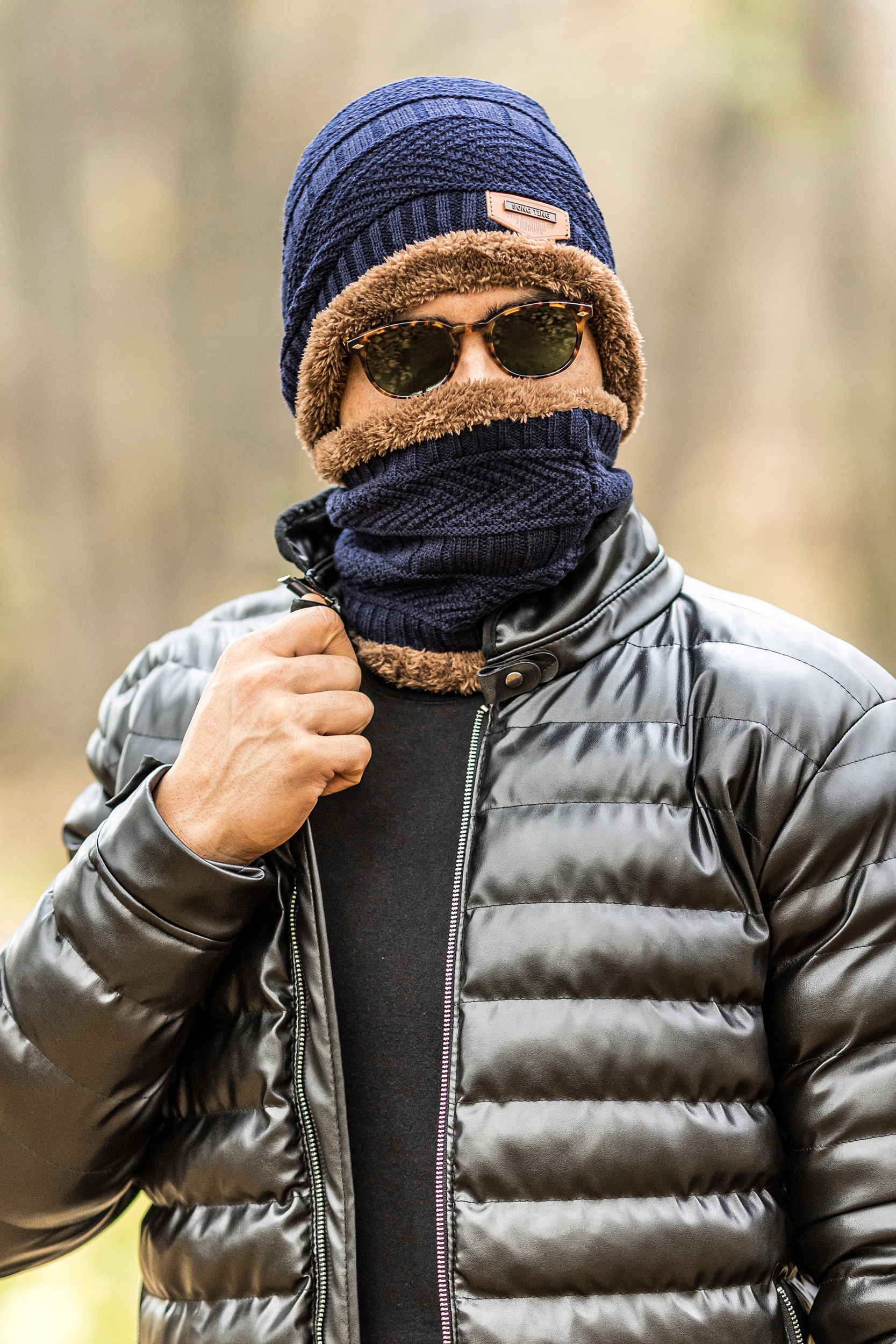 Cap + Dimney Men's Set з хутром - темно -синій