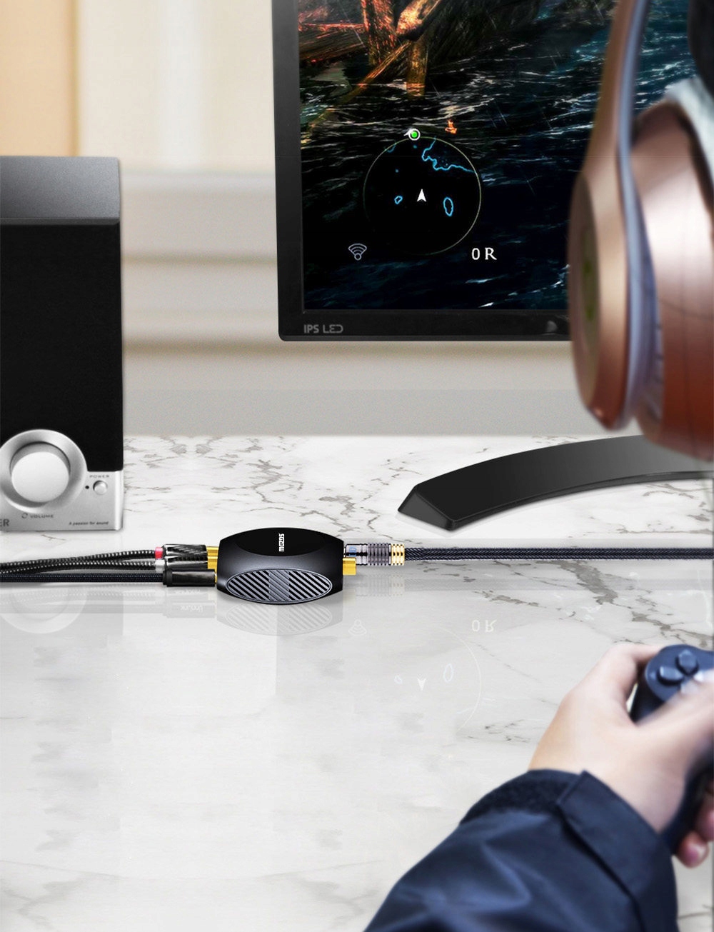 Ви можете підключити конвертер до телевізора за допомогою коаксіального кабелю Toslink (також називається цифровим S/PDIF або оптичним кабелем), а потім під’єднати його до підсилювача (динаміків) за допомогою кабелю RCA або до навушників за допомогою кабелю зі стереороз’ємом 3,5 мм . Конвертер також можна використовувати з PS3, PS4, XBox, Xbox One, програвачами Blu-ray, HD DVD тощо, які не мають виходів RCA (L/R) або виходів 3,5 мм. У DAC-N3 ви можете вибрати між двома портами – оптичним або коаксіальним.