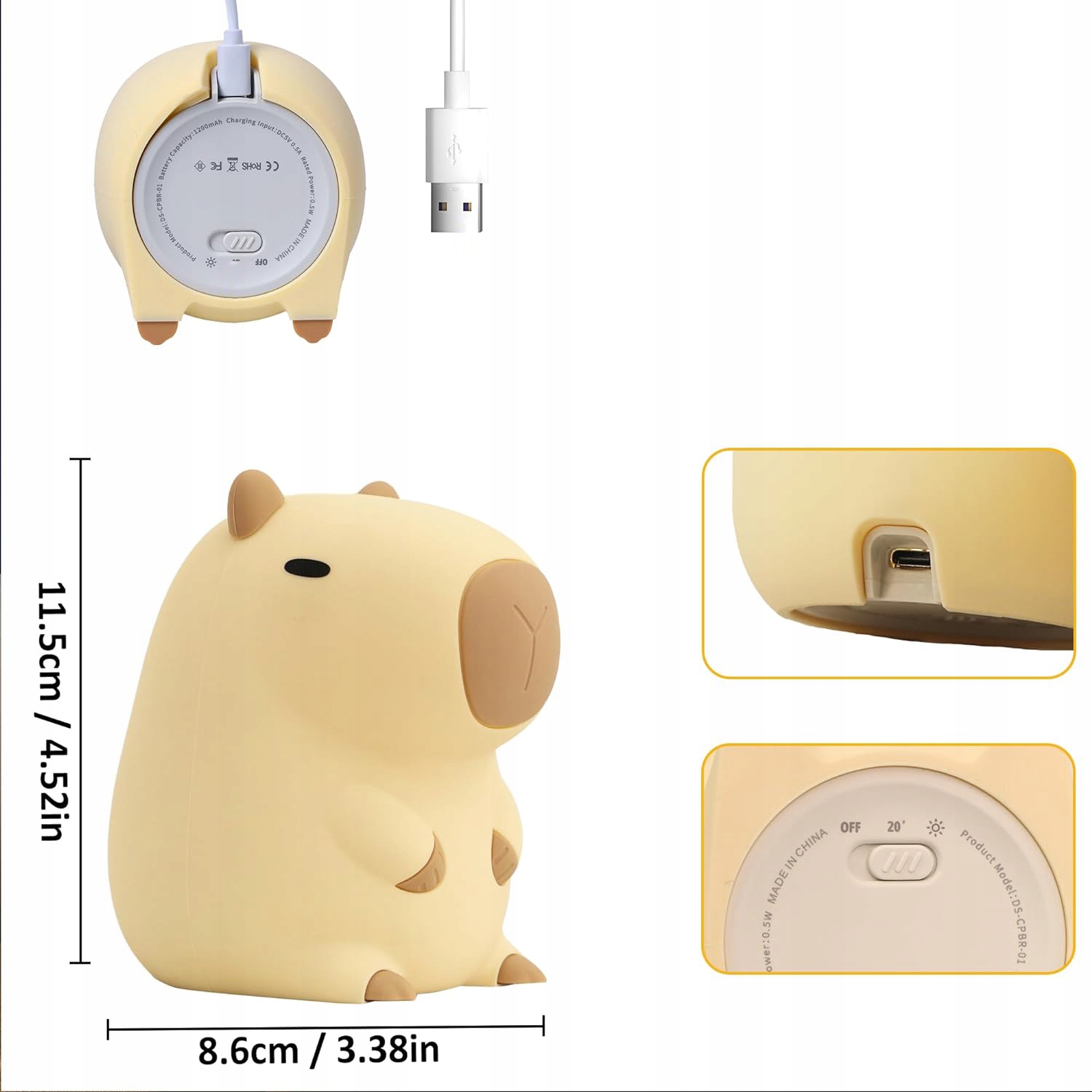 - Нічник має 2 режими яскравості (темний, світлий), ви можете регулювати яскравість світла торкаючись капібари.