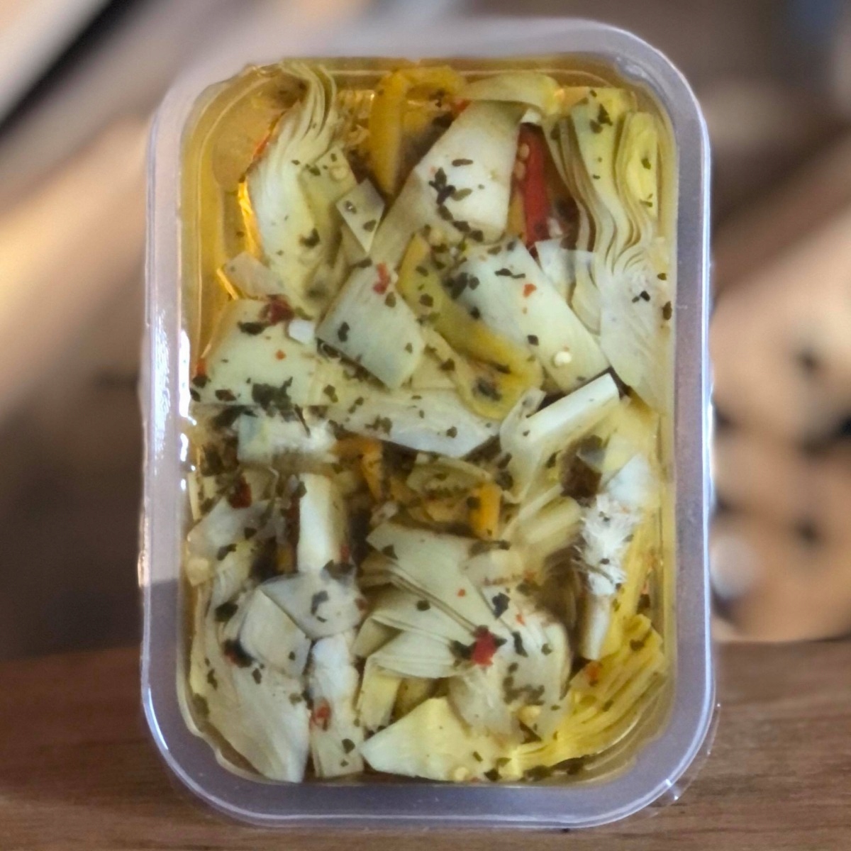 Салат без консервантів та штучних добавок, лише артишоки, соняшникова олія, пепероні, петрушка, пеперончіно, оцет та сіль.