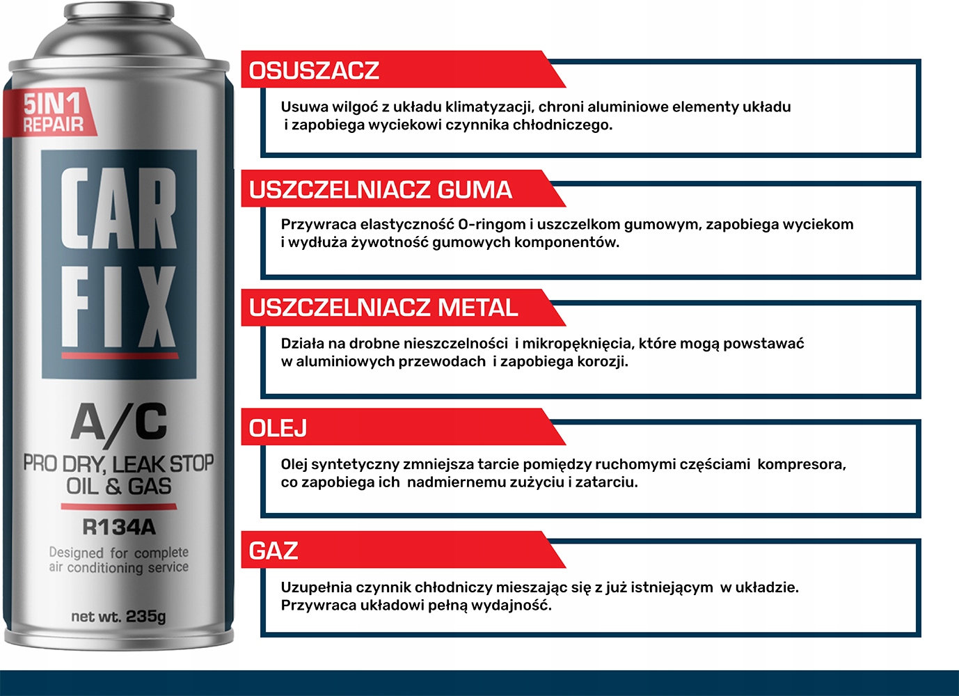 carfix 5in1 Repair r134a - заміна r134a - - це революційна підготовка з всебічною операцією, призначеною для незалежної (самостійної) проведення комплексної служби кондиціонування, менш ніж за 5 хвилин, не відвідуючи спеціалізовану рослину, без використання спеціалізованих інструментів обслуговування та без створення вакууму 23 HPA. Контейнер на 400 мл працює з зарядним кабелем із манометром тиску Carfix GH_A, який дозволяє наповнити вміст упаковки до системи кондиціонування кондиціонування 90% пасажирських транспортних засобів, в яких система кондиціонування працює від фактора R134A, тобто автомобілі, що виробляються до 2016 року. Газ Carfix є повністю екологічним і не сприяє ґрану. It is mixed successfully with gas R134a, while the ingredients it contains and 5 substances: drying the A/C cooling system from harmful watercolors of water, seals the system (both rubber elements, i.e. with rings and aluminum elements), Systnetic oil from groups PAG lubricates Air conditioning compressor, while gas is доповнений фактором до необхідного значення.