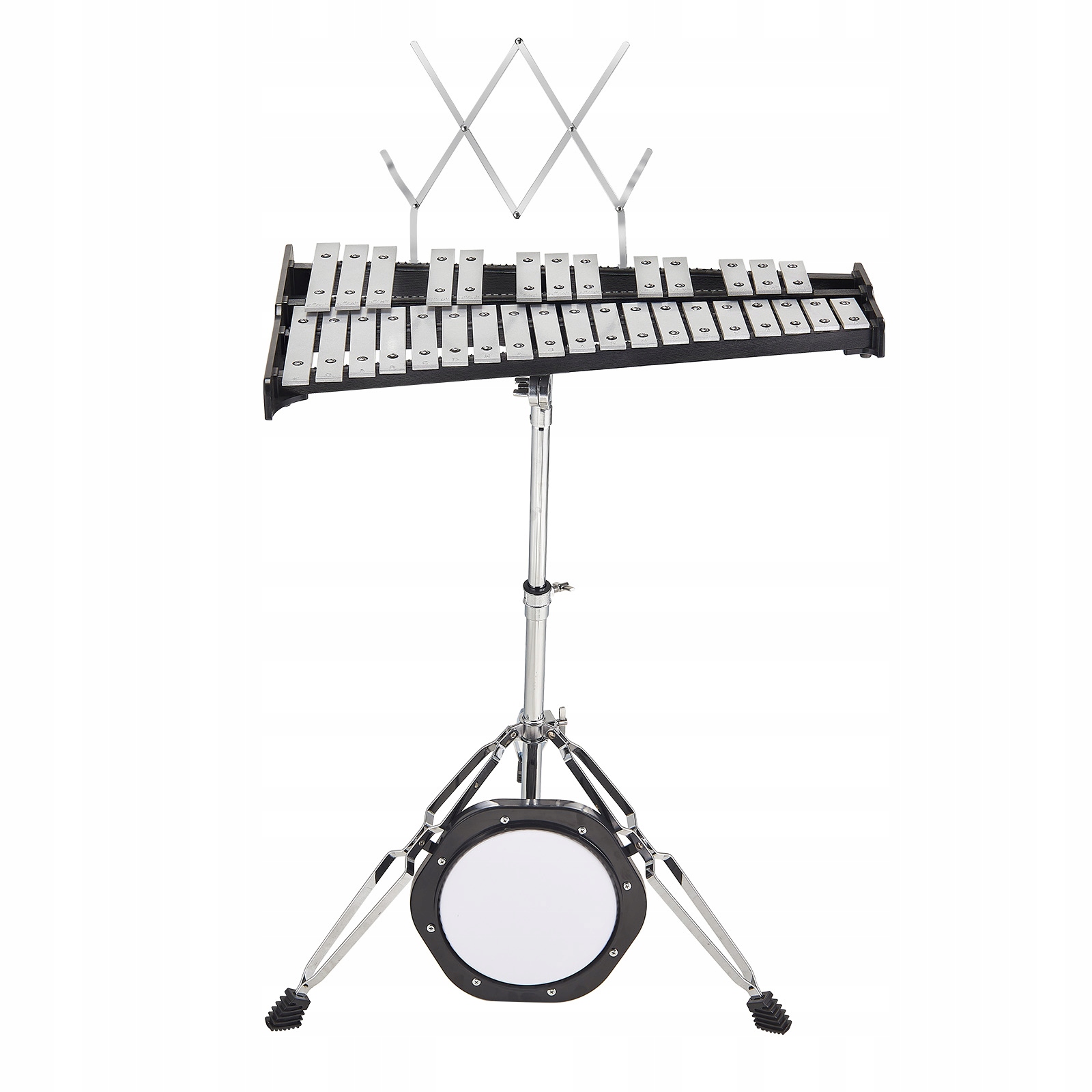 пакет "все в одному": глокенспіель ксилофонний комплект Glockenspiel. Набір включає: 1 x 32-Nut Xylophone, 1 x мішок для перенесення, 1 x регульована підставка, 1 х вправи для музичних стендів, 4 x молотки, 2 x барабанні палички, 1 x посібник користувача (або ні в німецьку), 2 x clamp; 8-дюймовий вправний майданчик забезпечує реалістичний досвід гри на барабанах; Оцинкована музична підставка з суцільною конструкцією та комбінація затискачів допомагає прикріпити нотатки до зручної щоденної практики, а тому підходить для ручного використання.