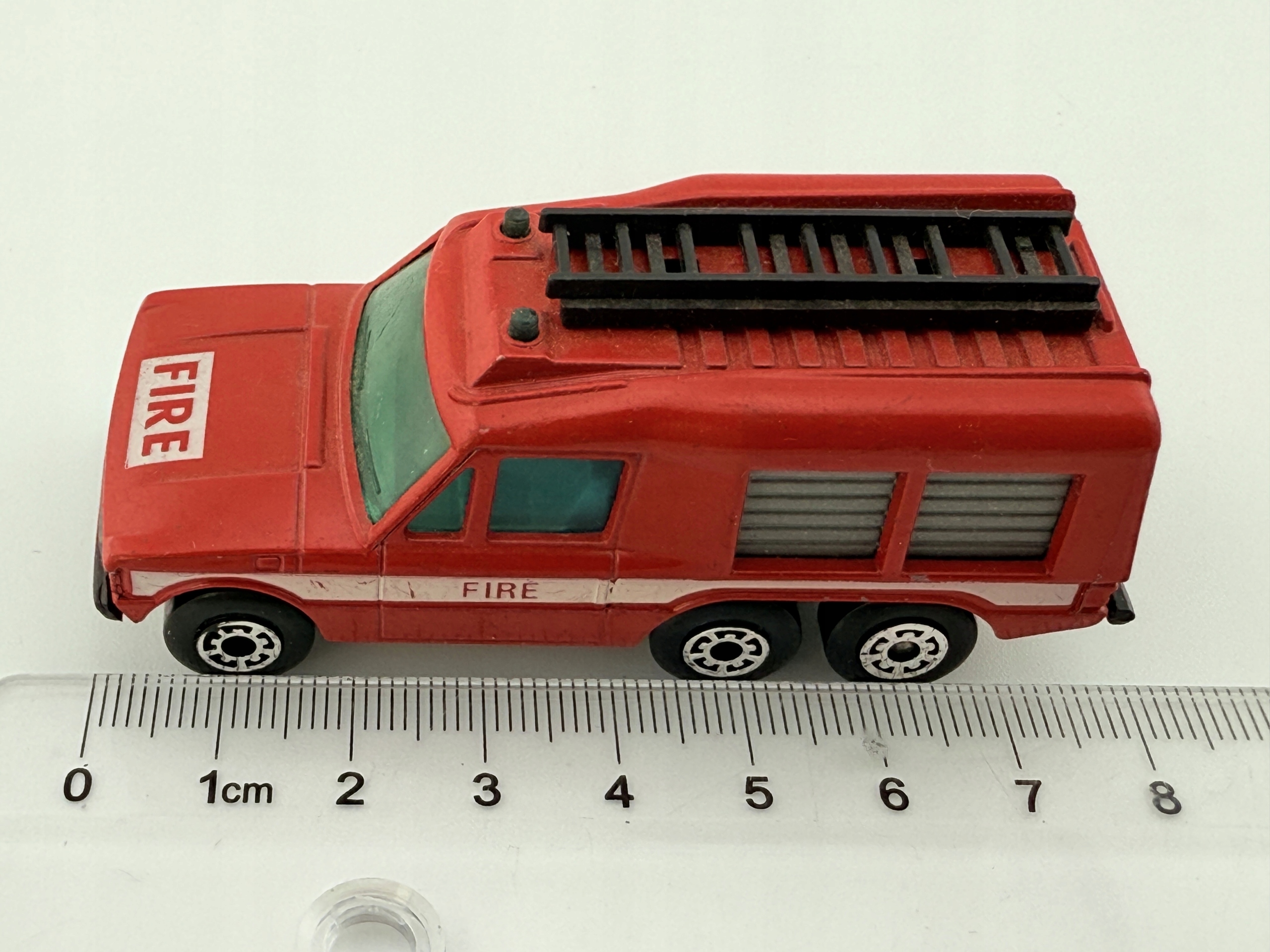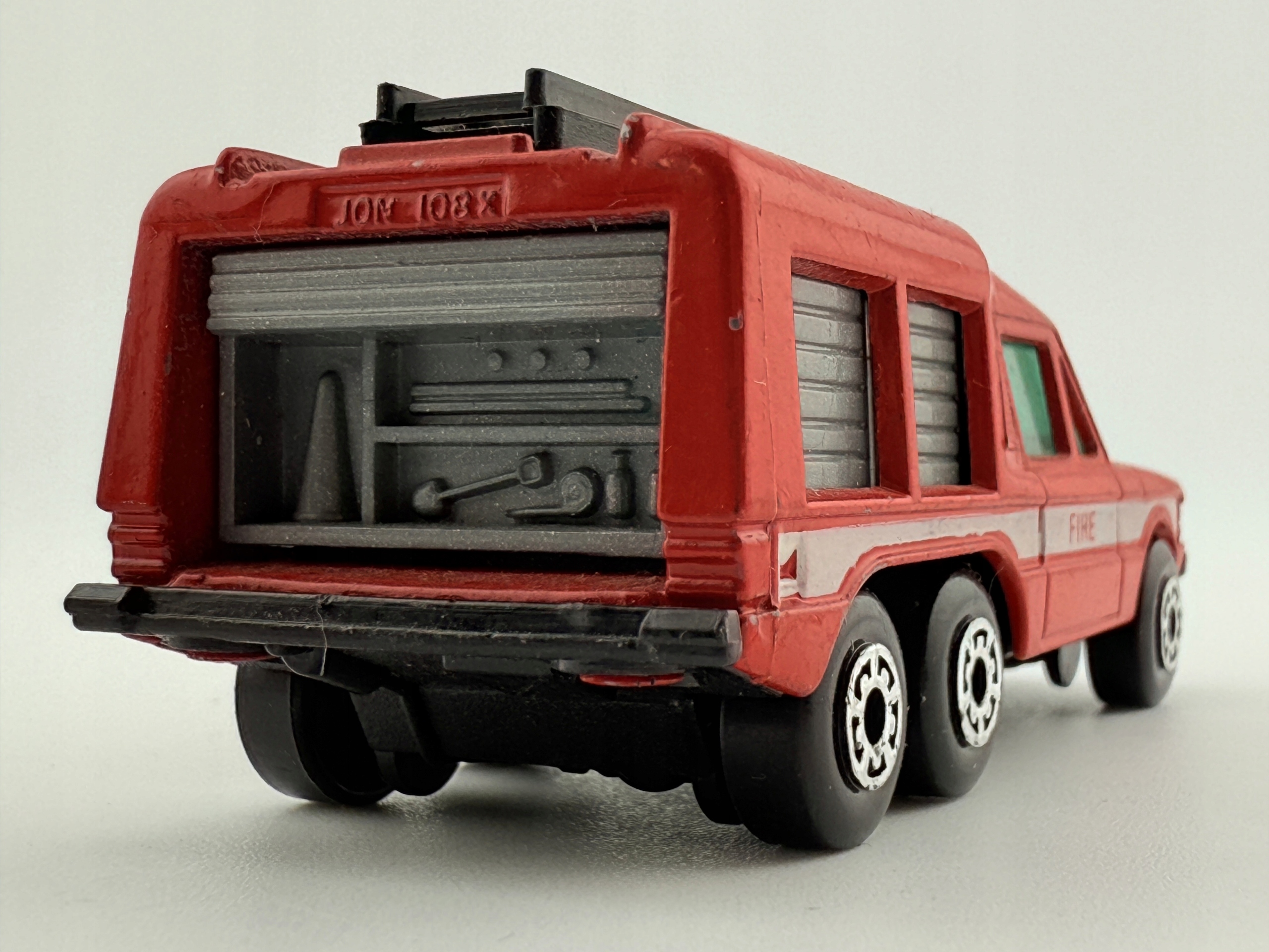 Бренд: Matchbox • Модель: Carmichael Commando • Виробник: Matchbox • Масштаб: 1:75 • Умова: Використовується • Матеріал: метал + пластик • Довжина (мм): 70 • Кольори: Червоний з білими написами "Вогонь" • Додавання: дахи на даху • Номер каталогу: Jon 108 x • Зроблено в: Макао