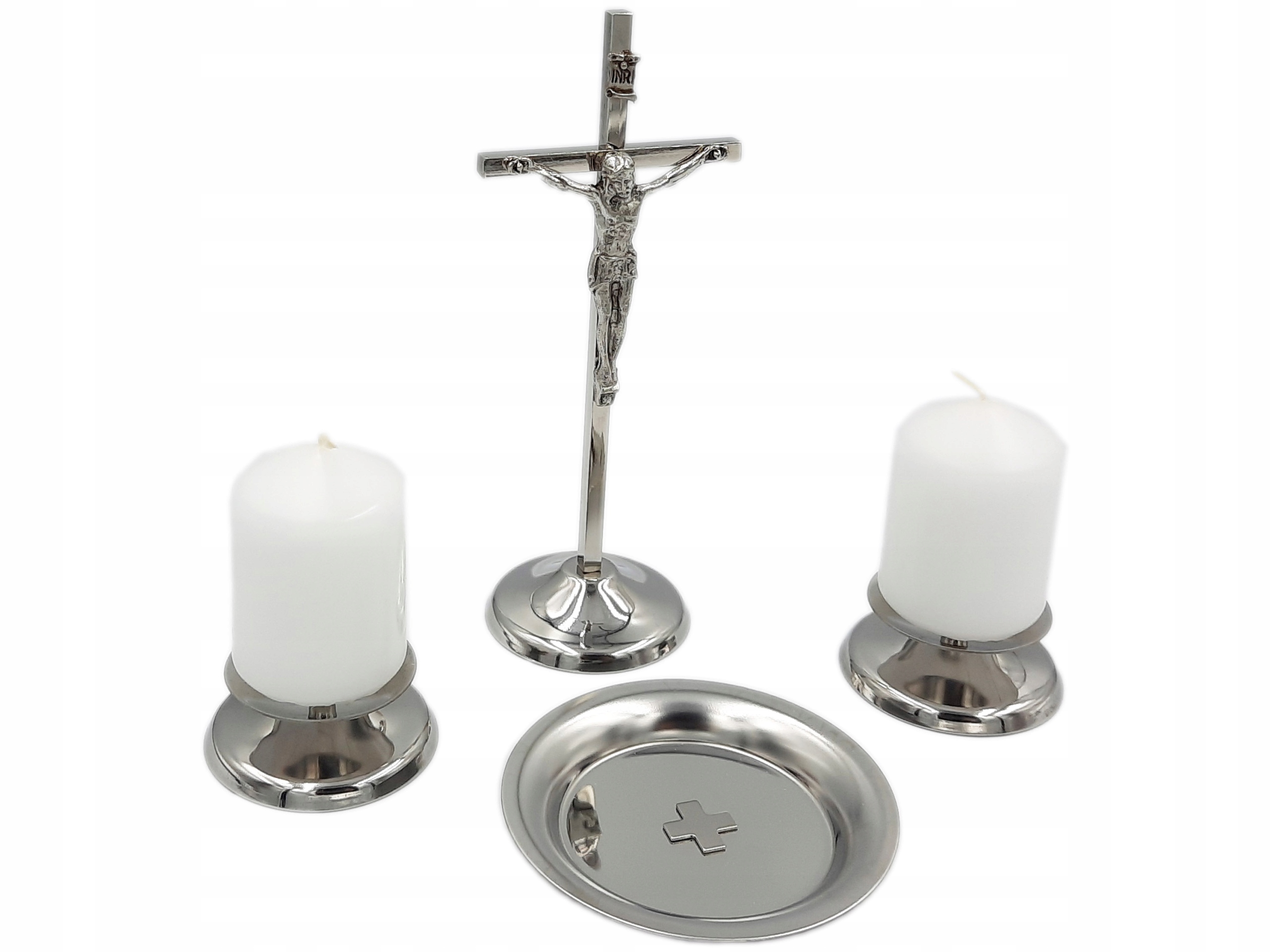 Набір складається з стоячого металевого хреста висотою 16 см, двох підсвічників для свічок з шипами та чаші для свяченої води. Додатково в коробку входять дві білі свічки з шипами.