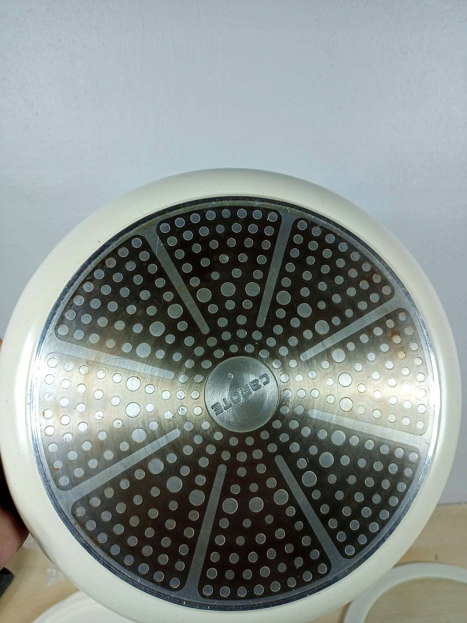 Виріб, що був у використанні. Має подряпини. Картонна упаковка пошкоджена або замінена. Найчастіше пошкоджується одна з більших каструль в наборі. На інших горщиках є дрібніші подряпини. Реальні фото