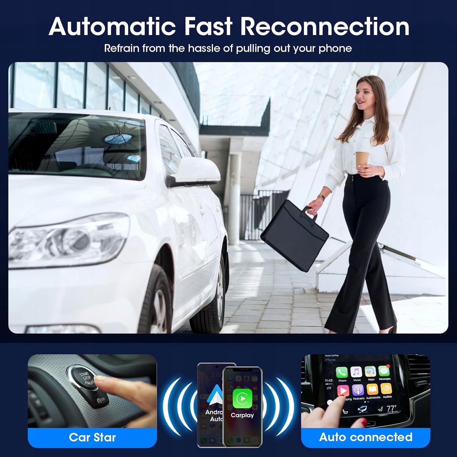 У вас уже є заводські CarPlay або Android Auto, але вам щоразу доводиться підключати телефон кабелем? Цей міні-адаптер Vtopek 2in1 є справжньою революцією для водіїв - підключивши його один раз, ви отримаєте повне бездротове з'єднання з вашим автомобілем. Жодних кабелів, жодного очікування та жодних маніпуляцій. Телефон під’єднується сам – кожного разу, коли ви заводите автомобіль.