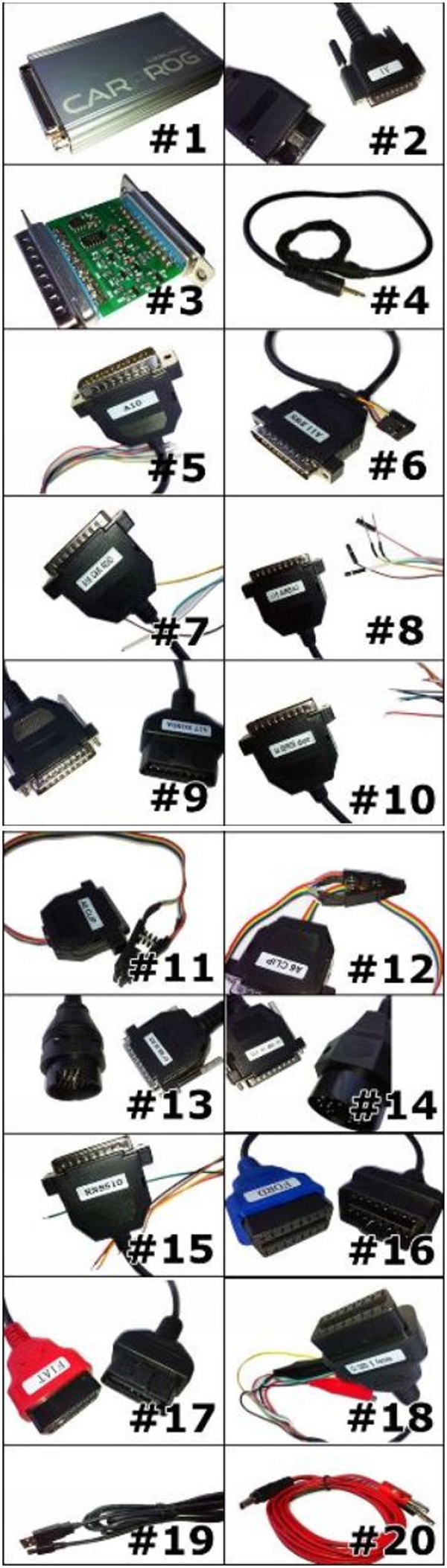 Основний апаратний інтерфейс CarProgA1 - Кабель-адаптер OBD2 (перемикачі K-line та шини CAN. Використовуйте з усіма автомобілями, на які скаржиться OBDII)D1 - Адаптер одометра-подушки безпеки (приладова панель, адаптер програмування Airbag)A3 - Транспондерна антена (використовується з усіма іммобілайзерами CARPROG)A10 - Кабель адаптера Motorola (адаптер програмування Motorola MCU )A11 - Кабель-адаптер BMW EWS (використовується з BMW Immo)A16 - Кабель автомобільного радіо (використовується для декодування автомобільного радіо Philips Opel, Renault, Peugeot, Citroen)A15 - Кабель (використовується з адаптером D1, універсальною приладовою панеллю автомобіля та адаптером програмування подушок безпеки)A17 - Кабель OBD2 подушки безпеки Honda (адаптер для скидання подушок безпеки Honda через OBDII) A4 - Кабель-перехідник Eeprom (використовується для програмування eeprom)A5 - Кабель із затискачем DIP8 (затискач DIP8 для програмування eeprom)A6 - Кабель з затискачем SOIC8 (затискач SOIC8 для програмування eeprom)< /li>A7 - 38-контактний кабель MB (використовується з MB Airbag і програмним забезпеченням панелі приладів)A8 - 20-контактний кабель BMW (використовується з подушкою безпеки BMW і програмним забезпеченням панелі приладів)Кабель-адаптер RNS510 (кабель інтерфейсу радіодекодування RNS510)Кабель VOLVO FORD CAN 2006+ (потрібний для програмування подушок безпеки та приладової панелі)Кабель FIAT CAN 2006 (потрібен для подушок безпеки та панелі приладів) програмування)C1 OBD2 Гніздо кабельUSB-кабельКабель живленняCD (файли посібника користувача з довідкою у форматі pdf)Посібник користувачаПОДАРУНКОВА КОРОБКАРахунок/рахунок-фактура