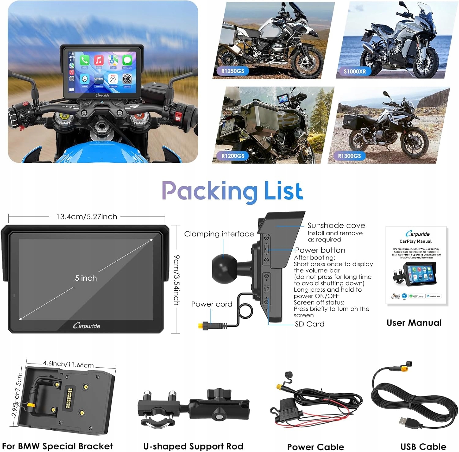 CARPURIDE W502PRO B ДИСПЛЕЙ MOTO CARPLAY ANDROID AUTO 5 ДЮЙМОВ GPS