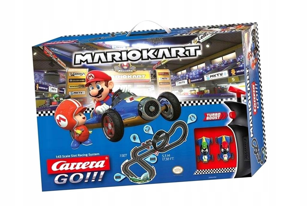 У набір входить: - Nintendo Mario Kart Mach 8 - Mario 64148 - Nintendo Mario Kart Mach 8 - Luigi 64149 - 1 з'єднувальна рейка - 1 трансформатор - 2 контролери - звуження та перетин - похилий поворот - петля - лічильник кіл - запасні змінні контактні щітки та напрямні - інструкції PL Розміри в розкладеному стані: 160 x 95 см Довжина доріжки: 5,3 м Carrera GO!!! — стартова система для Carrera Racing World, створена в масштабі 1:43. У всі набори цієї серії входить контролер турбонаддуву, а також оригінальні ліцензійні автомобілі, зроблені з великою увагою до деталей. До кожного з них завжди йде додатковий комплект контактних щіток. Завдяки унікальній системі фіксаторів системи треків надзвичайно легко збираються та розбираються.