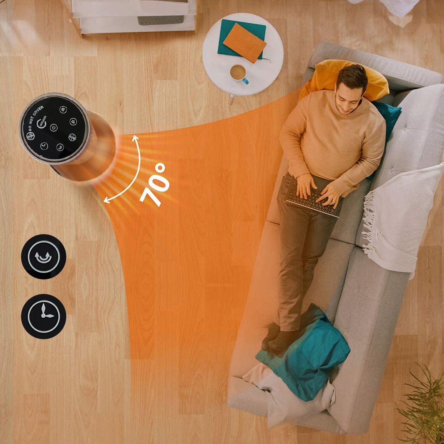 ➡️ Пристрій оснащенийавтоматичною осциляцією, завдяки чому радіатор розподіляє тепло по більшій поверхні, ніж у випадку радіаторівбез коливань. Пристрій автоматично обертається праворуч і ліворуч у діапазоні 70°.