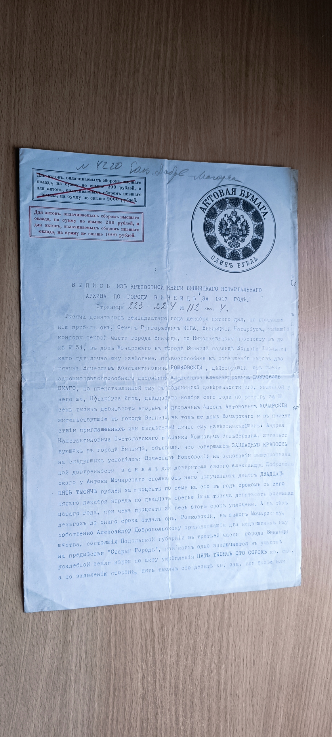 Просматривая «Carski odpis notarialny - Winnica - 1917» данный товар из каталога «Старые документы» вы можете быть уверены, что после оформления заказа, доставки в Украину, вы получите именно то, что заказывали, в оговоренные сроки и европейского качества.
