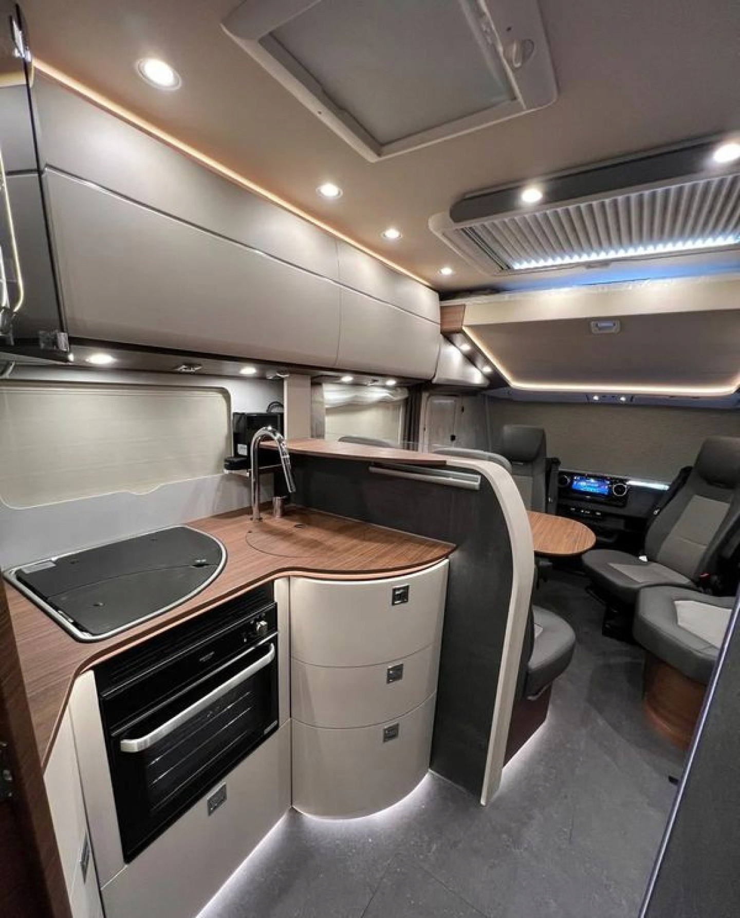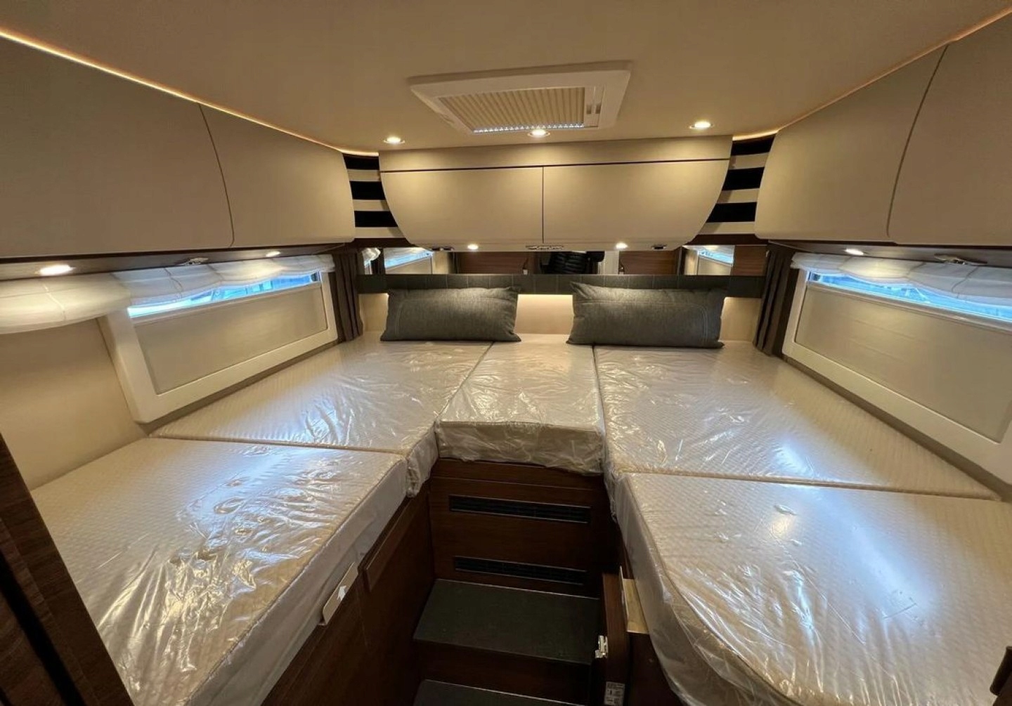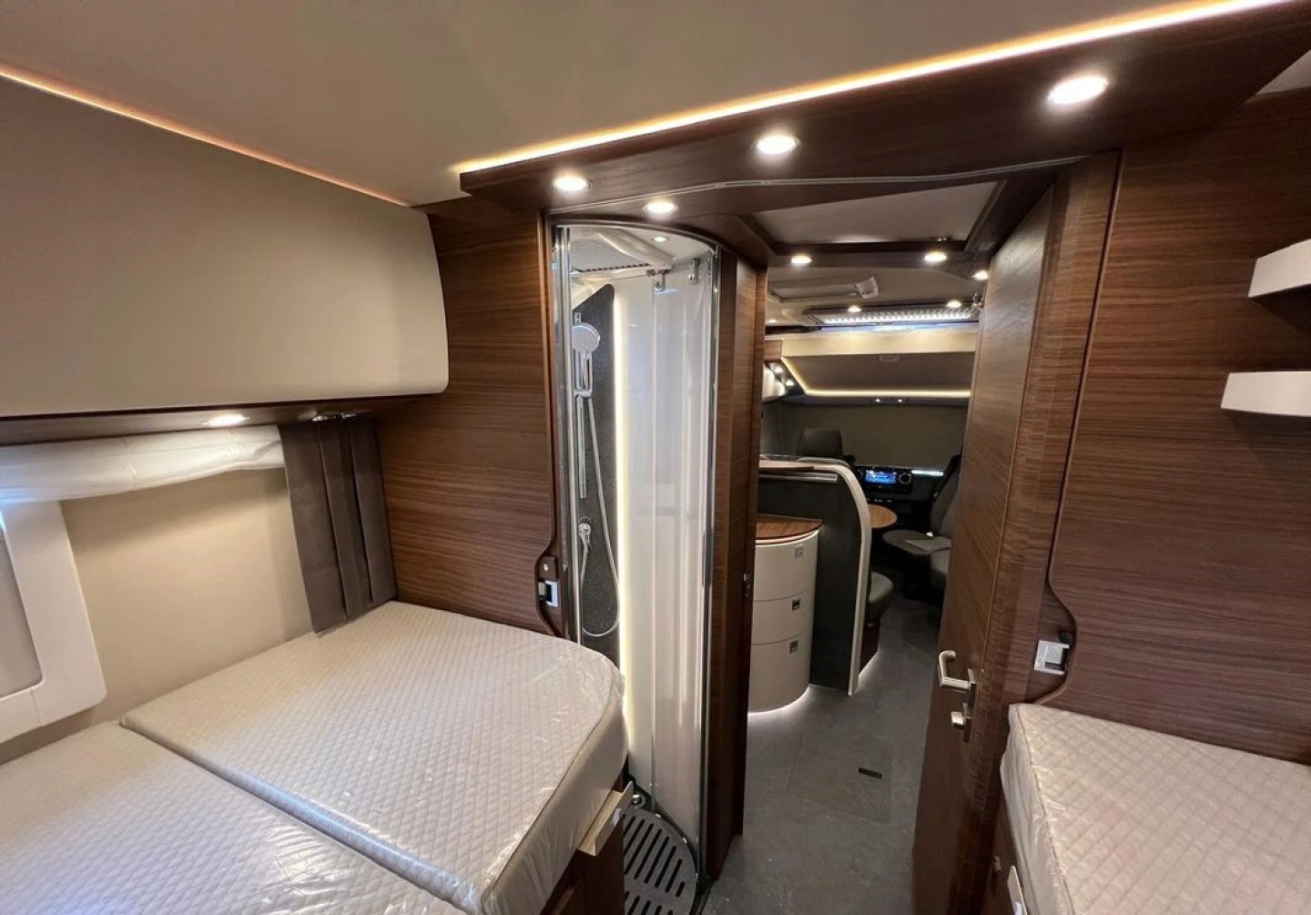 кабелі для супутникової системи, USB-роз’єм у шафі над заднім ліжком, покращений гараж для скутера з повстю та сітками для багажу, вентиляцію туалету SOG через димохід на даху, 92-літровий паливний бак, кабелі для камери заднього виду (один об’єктив), електричне стоянкове гальмо, дорожній знак помічник розпізнавання, інструмент панель з кольоровим дисплеєм,Регулювання сидінь водія та пасажира (по куту нахилу та по висоті, спереду та ззаду),Центральний замок дверей салону та житлової зони з дистанційним керуванням та функцією «Coming Home»,Сенсор дощу (Mercedes),Кольорові дзеркала автобуса чорно-білі, Мультифункціональне кермо, Геліоматеріали, Передня вісь з підвищеною вантажопідйомністю, Вхідні двері XL «Premium Two 2.0» (шириною 63 см) з подвійними замок, вікна та москітна сітка, радіо підготовка з даховою антеною DAB+, 4 динаміки, прийом DVB-T2, дизайнерська барна стійка з тримачем для скла та набором склянок над кухнею, зарядний пристрій/підсилювач, мультимедійна система MBUX 10.2" з навігацією та DAB+, Truma DuoControl CS, задні опори рукоятки для запобігання розгойдування в нерухомому стані, камера заднього виду з одним об’єктивом і монітором 7"