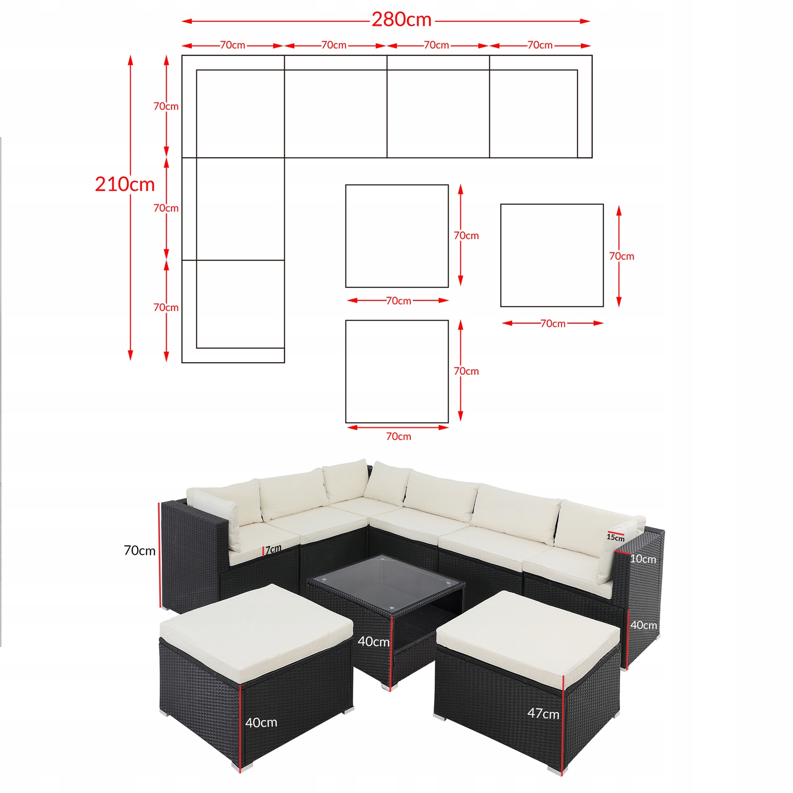 - Розміри лаунж-набору: (ДхШхВ) 280 x 210 x 70 см