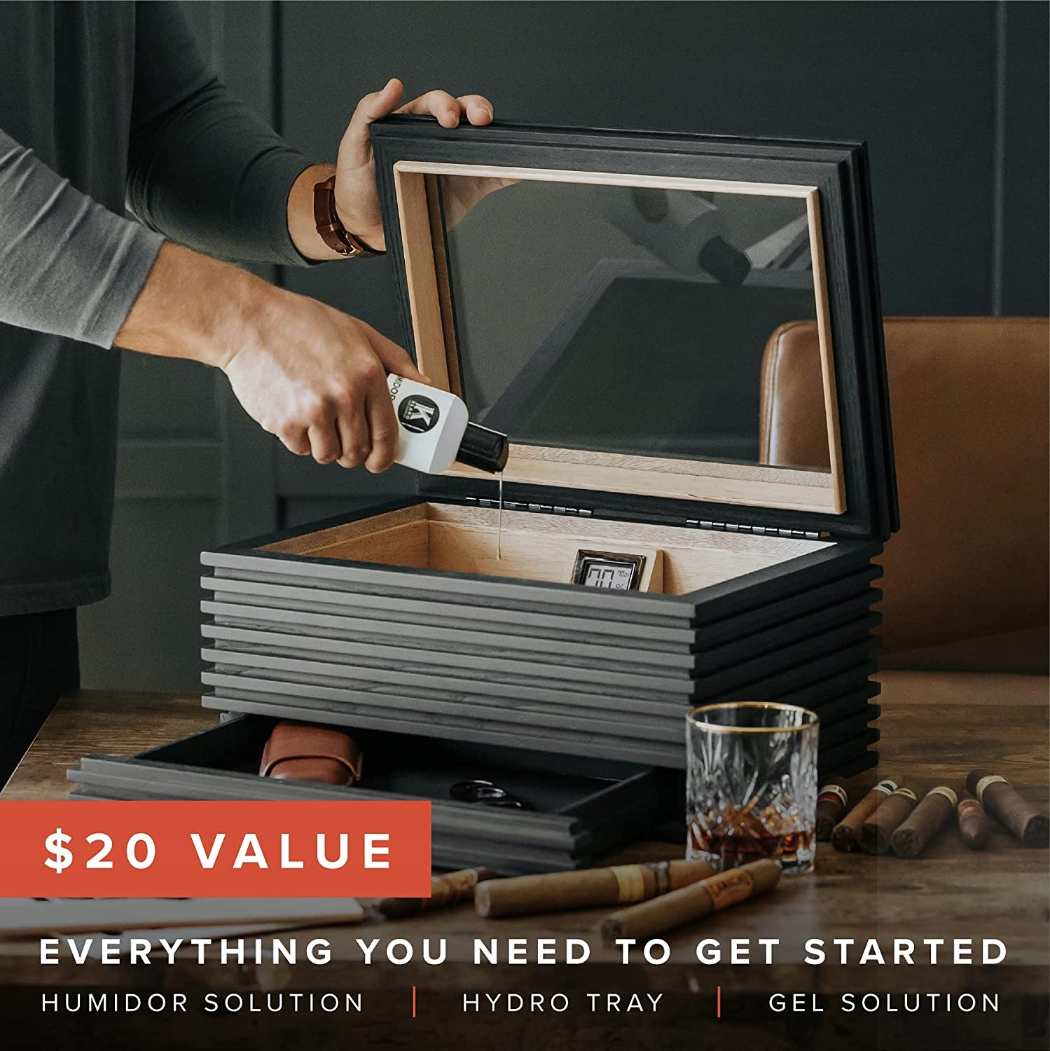 ЩО РОБИТЬ НАС КРАЩИМИ? ► Повна система зволоження з х’юмідором для початку, більше кедрового дерева, герметичні гігрометри, ящик для аксесуарів і герметична кришка. Ваші сигари зберігатимуться в хьюмідорі компанії, яка піклується про них. ★ ВХОДИТЬ УСЕ ДЛЯ ПОЧАТКУ ► Hydro System — це повністю інтегроване рішення для зволоження, яке включає 2 стартові пляшки розчину для зволоження. У той час як інші хлопці не дають вам нічого або дешеві губки, які не працюють, наша система зволоження проста і встановлює вологість між 65-72% RH залежно від ваших уподобань. ★ БІЛЬШЕ КЕДРУ ► У той час як інші х’юмідори вкриті кедровим шпоном товщиною 0,2 мм, внутрішня частина KOBI заповнена серцевиною кедра товщиною 5 мм, яка належним чином приправляє палички, а також робить обслуговування х’юмідора безпроблемним. ★ ЯЩИК ДЛЯ АКСЕСУАРІВ - ТРИМАЙТЕ ІНСТРУМЕНТИ ПІД РУКУ ► Зберігайте запальничку, ніж, дорожній футляр та інші аксесуари Klaro у висунутому м'якою фетром ящику. У закритому стані унікальна шухляда в х’юмідорі KOBI зливається з навколишнім середовищем, створюючи єдиний вигляд. (Аксесуари не входять до комплекту) ★ ЦИФРОВИЙ ВОЛОГОМІР ► Цифрові гігрометри Klaro були розроблені з нуля, щоб бути точнішими та запобігати витоку всередині та назовні за допомогою силіконових ущільнювачів і найкращих у своєму класі датчиків вологості.