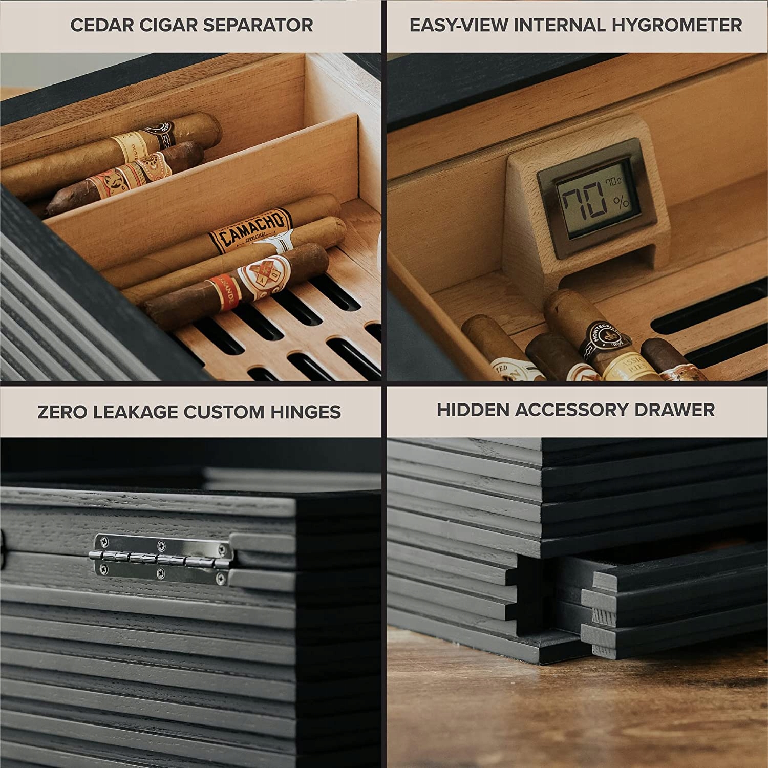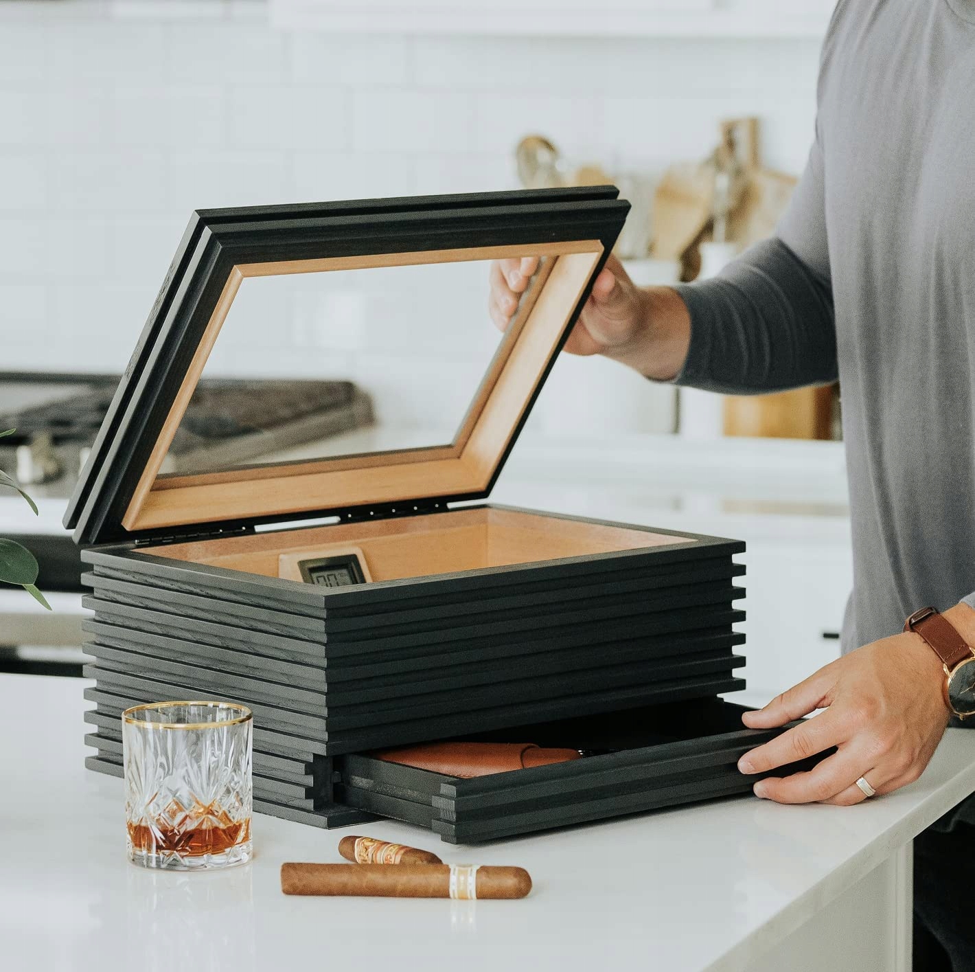 Сучасний скляний х’юмідор Kobi, темно-сірий дерев’яний дизайн, цифровий гігрометр, іспанський кедр, х’юмідор, гідросистема та прихована шухляда для аксесуарів – тримачі (50–80 сигар) від Klaro