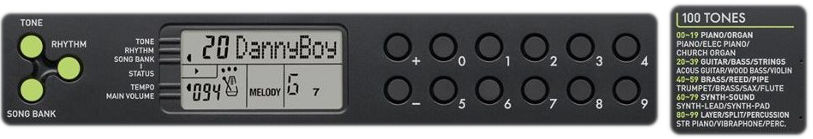 100 високоякісних звуків охоплюють усі групи інструментів - від класичного піаніно до синтезаторів. Легкий вибір звуків за допомогою цифрової клавіатури та кнопок «+» і «-».