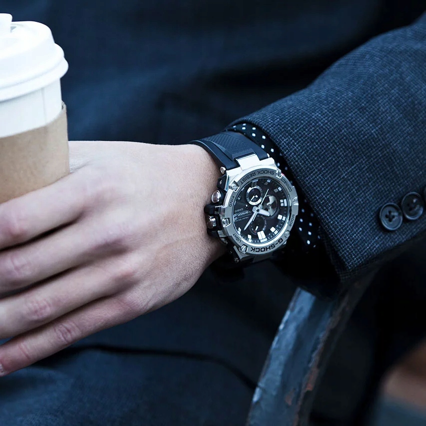 Casio GST-B100-1AERце модель, оснащена технологією G-Shock, що робить її одним із найміцніших годинників у світі. Функціонування годинника підтримується системою Tough Solar (живлення від сонячної енергії). Корпус виготовлений з високоякісної нержавіючої сталі. Конверт підвішений на міцному та зручному пластиковому ремені, що гарантує оптимальний комфорт навіть при багатогодинному носінні. Додатково годинник має модуль Bluetooth 4.0 з низьким енергоспоживанням, який дозволяє підключити годинник до смартфону, що дає доступ до багатьох додаткових функцій, наприклад пошуку загубленого телефону. Аналоговий циферблат чорного кольору має світлодіодне підсвічування і необрід (флуоресцентні стрілки). Циферблат покритий гнучким мінеральним склом, яке є стійким до осколків. Водонепроникність 200 м дозволяє легко контактувати з водою.