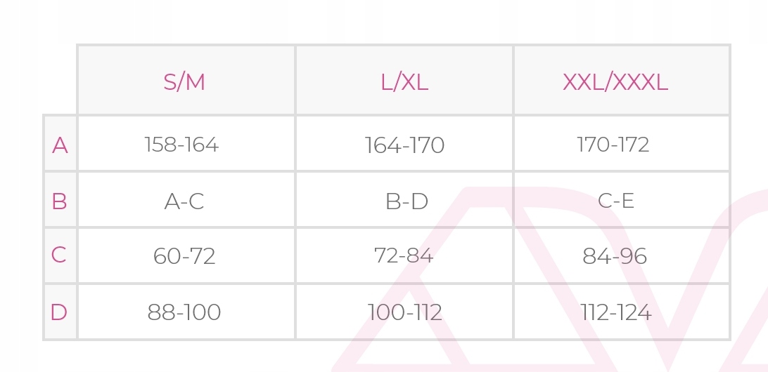 Таблиця розмірів: A: Зріст B: Бюст C: Талія D: Стегна