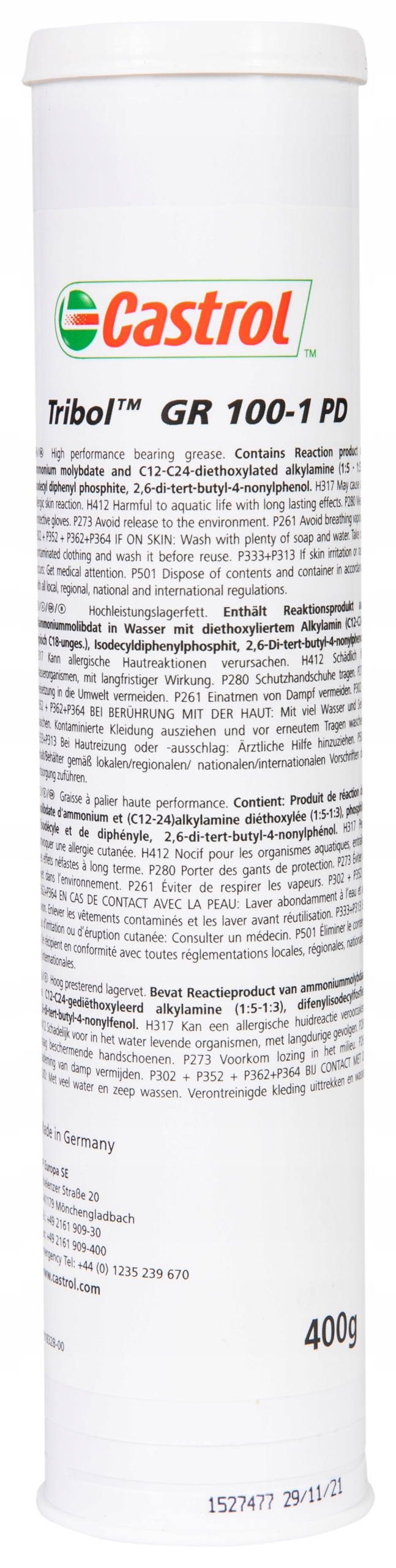 CASTROL TRIBOL GR 100-1 PD - ТРУБА ПІДШИПНИКА 400 Г. КОМФОРТНА ДЛЯ ВИКОРИСТАННЯ В МАСТИЛЬНИКАХ ПНЕВМАТИЧНИХ ТА ЕЛЕКТРИЧНИХ ЄМНІСТЮ 400 Г.