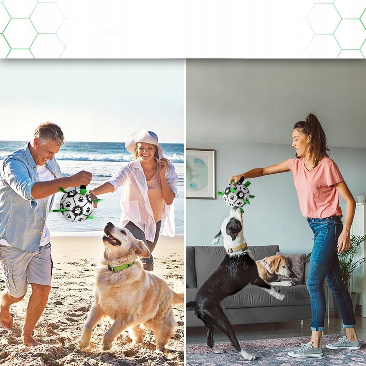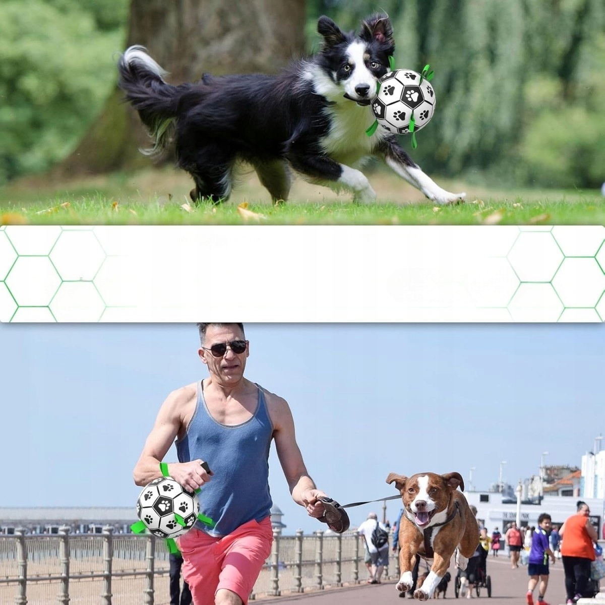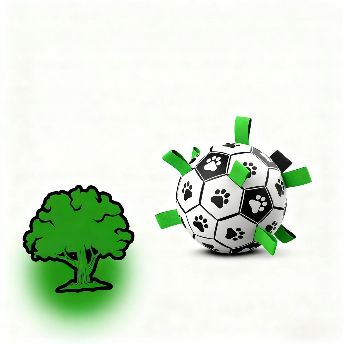 Унікальна конструкція мотузкового футбольного м'яча відповідає потребам собаки кусати, ганятися та дресирувати. У той же час чорно-біло-зелений візерунок, адаптований до зору собаки, ефектно привертає її увагу.