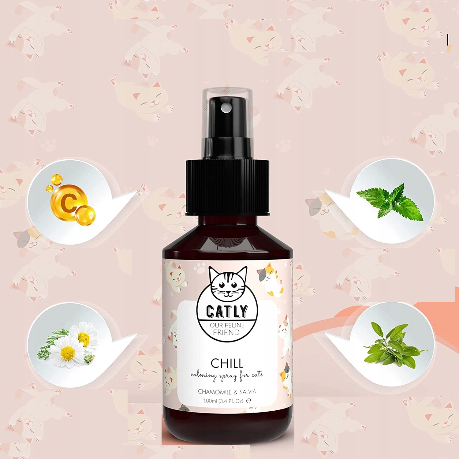 - Заспокійливий засіб для котів з ніжними компонентами - ромашка, шавлія та вітамін С є основними інгредієнтами нашого розслаблюючого спрею для котів. Вони створюють приємний аромат і м’яко та природним чином заспокоюють вашу кішку.