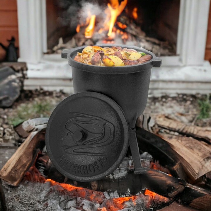 оригінальний котел Мейєрхофф виготовлений з найвищої якості з чавуну, стійким до найвищої температури y. Ця компанія вперше використала спеціальний вентилятор на обкладинці , що регулює тиск всередині котла, що робить його на 100% безпечним . Котел може стояти безпосередньо в багаттях, і завдяки зручному власнику його також можна повісити над вогнем . Продукт також має відкручені ноги , щоб котл міг бути розміщений у каміні або безпосередньо у вогнищі. Тисненням на обкладинці ви можете бути впевнені, що купуєте оригінальний та безпечний продукт .