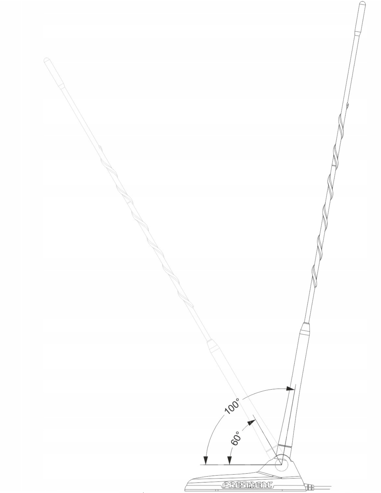 Нове покоління антени President Virginia має шарнір, який дозволяє встановлювати випромінювач під 3 різними кутами нахилу. Одне з налаштувань дозволяє вкоротити антену до 43 см! Це унікальна можливість налаштувати таку маленьку спіральну CB-антену порівняно з іншими конкуруючими продуктами.