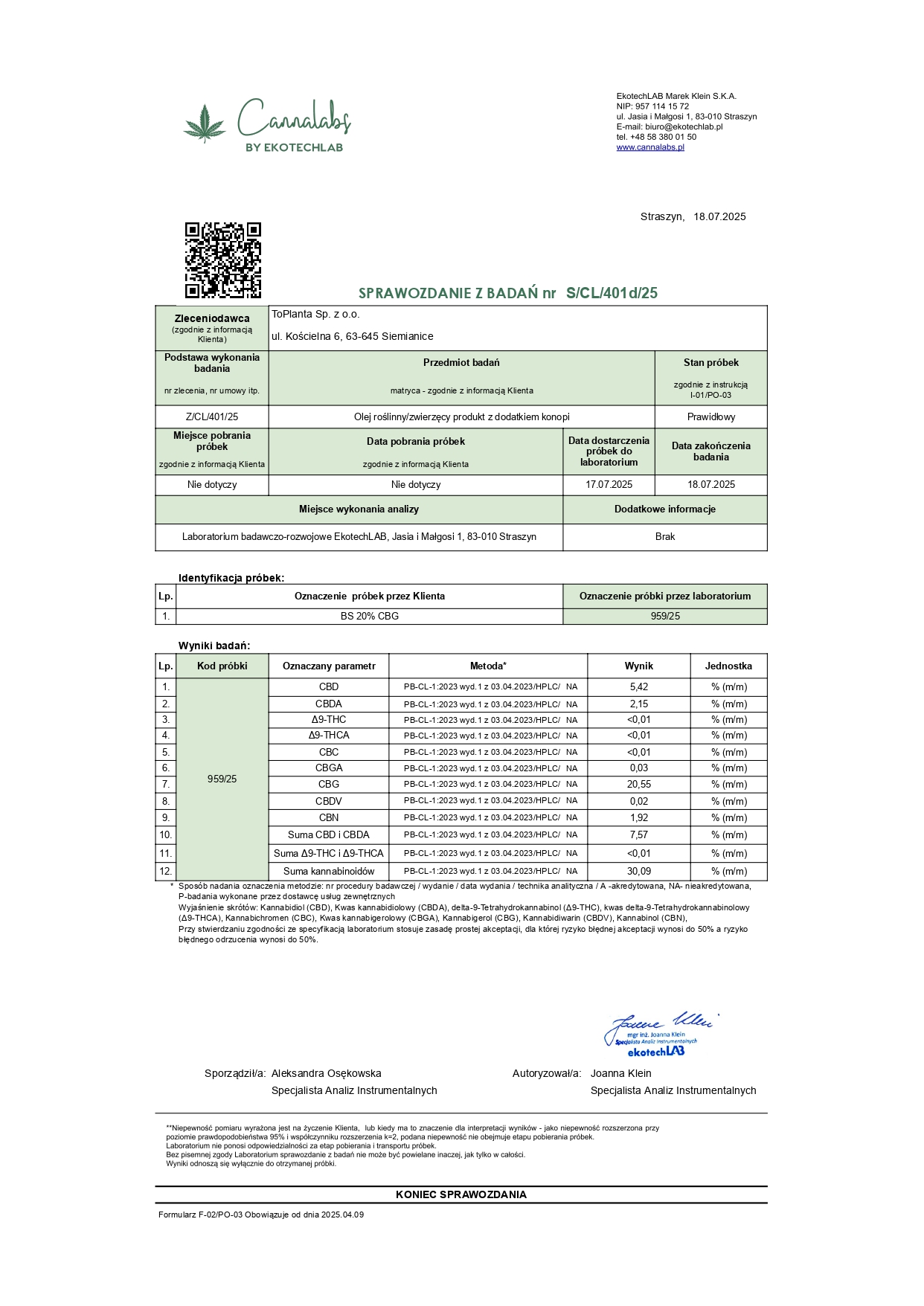 Наші олії багато в чому виділяються з численних конкурентів, наявних на ринку. Унікальний склад нафти підтверджується регулярними дослідженнями . На додаток до оголошеної концентрації основної канабіноїди, олії мають інше, що впливає на їх багатший смак та кращу дію . Що також дуже важливо, крім найцінніших компонентів фітосу, природно, що зустрічаються в рослині, таких як CBD та CBG, олія також включає широкий спектр інших канабіноїдів в оптимальних пропорціях для організму. Нижче ми представляємо контрольний тест у зовнішній лабораторії для наших масел CBD та CBG з концентрацією 10 та 20 %.
